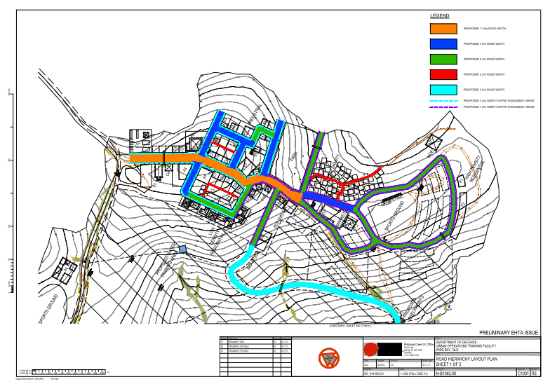 Most of what I’ve been doing so far is related to the early stages of bids and tenders, or so I thought (but these are in the middle and end game of the Jacobs initial process). There are 2 defence related bids of one and one health centre. The defence work if for the construction of an Urban Operations Training Facility (UOTF) and another Explosive Hazards Training Area (EHTA). Both are small in value and they are both located down near Sydney. This week the decision was made to “no go” the Holesworthy training area on the grounds that it wouldn’t have been profitable without winning the larger bid for Wide Bay. Too much risk I guess. The concept for the Wide Bay training area is shown below. The different colours denominate road types and widths.
