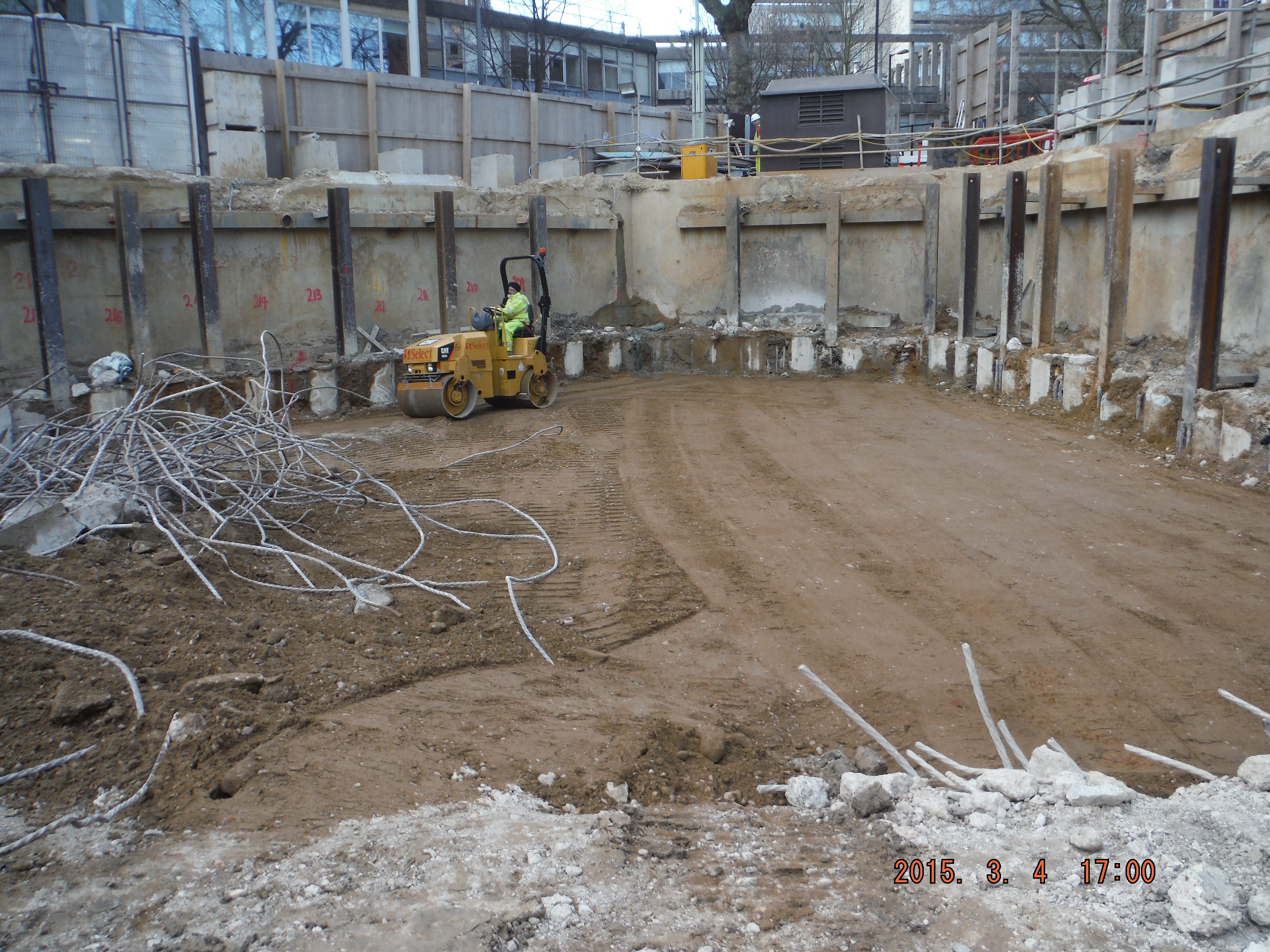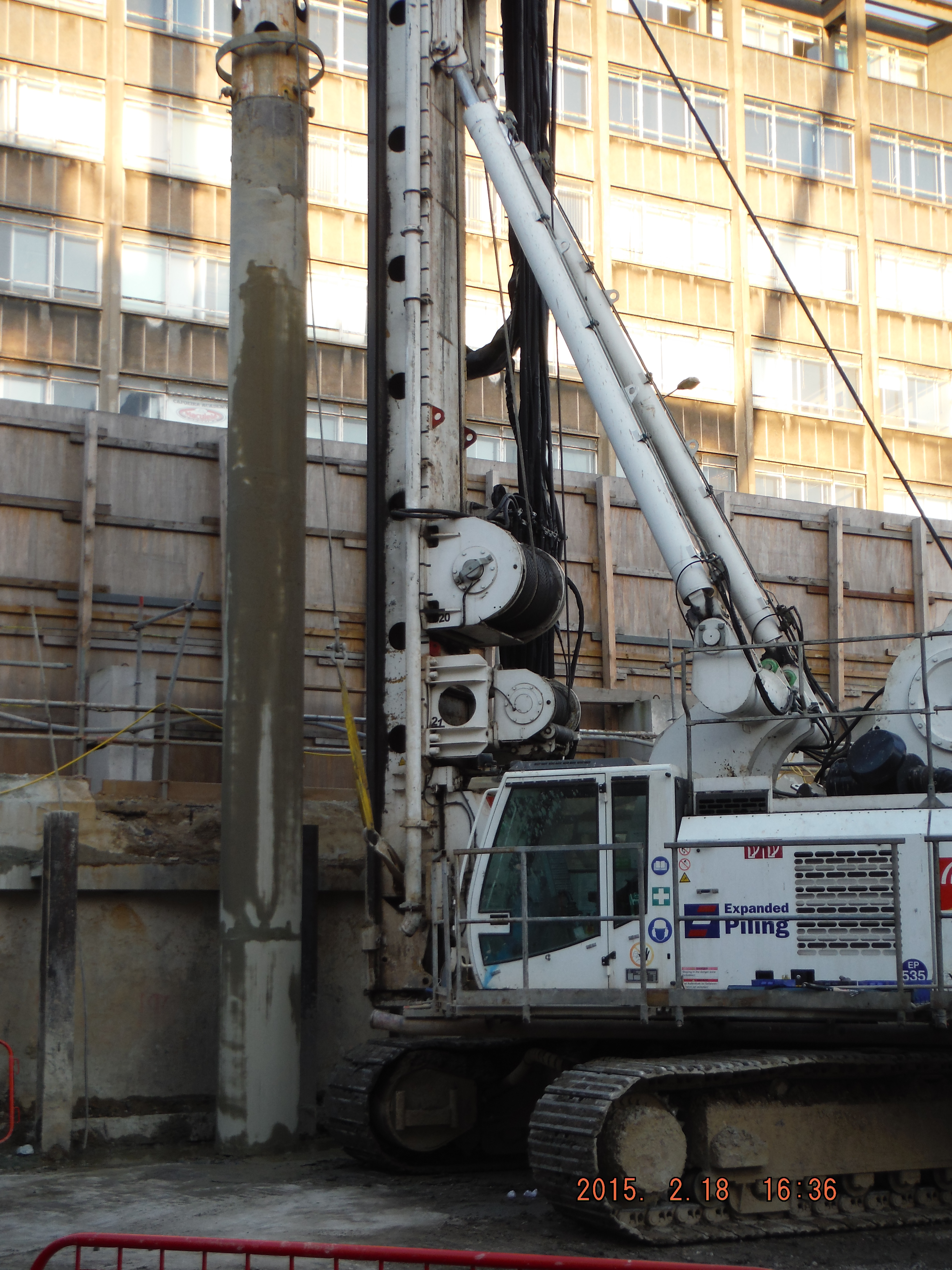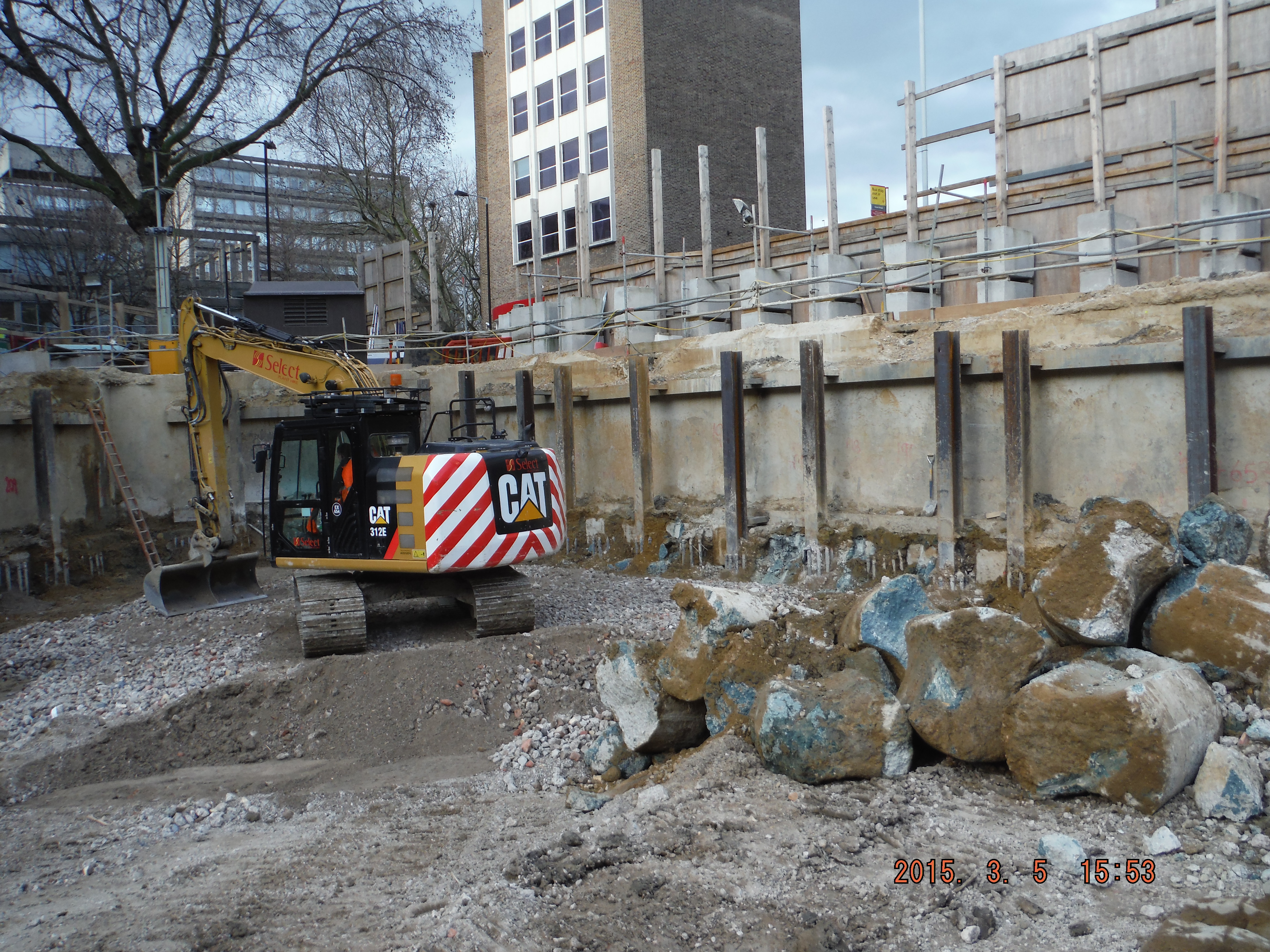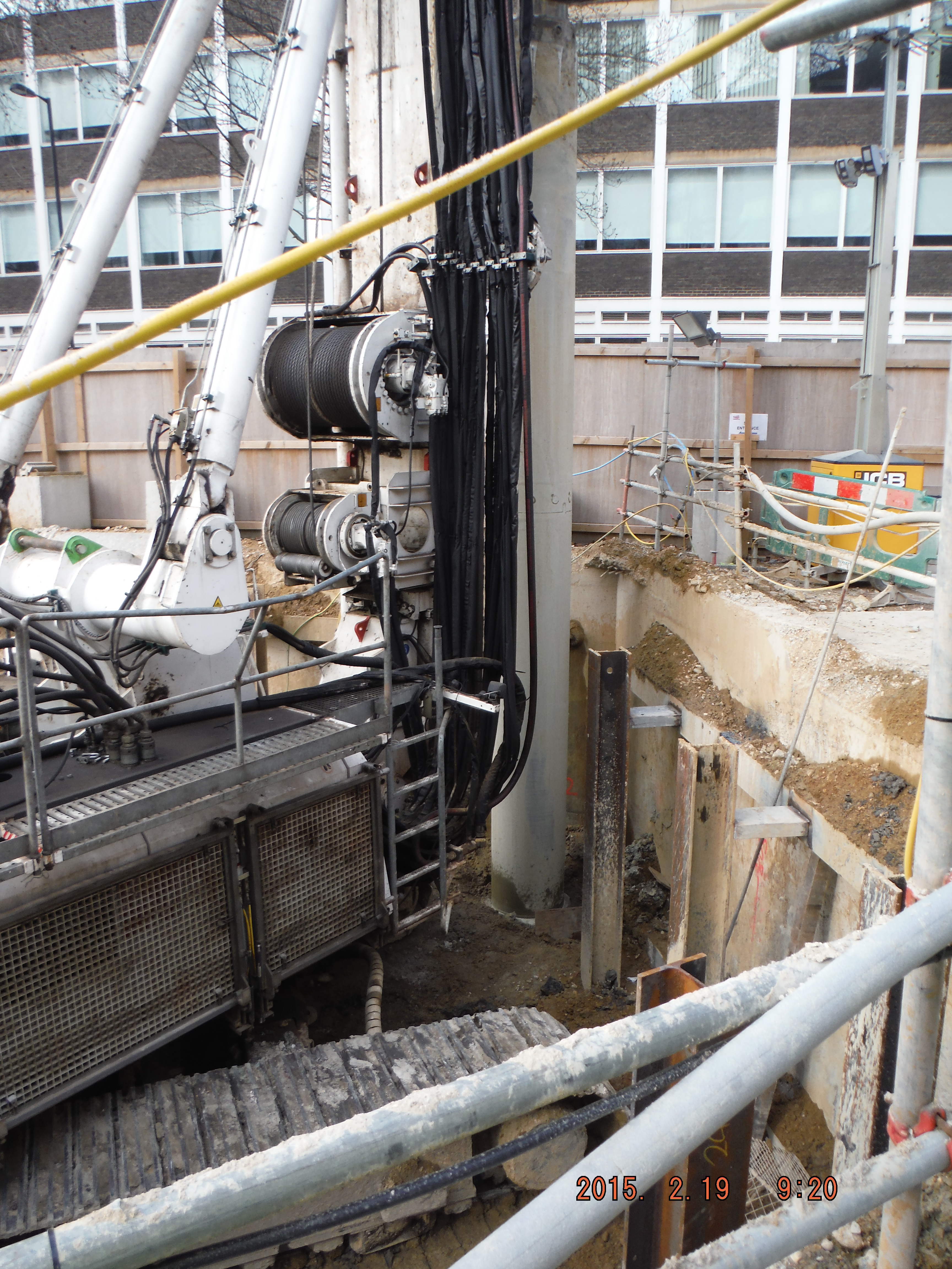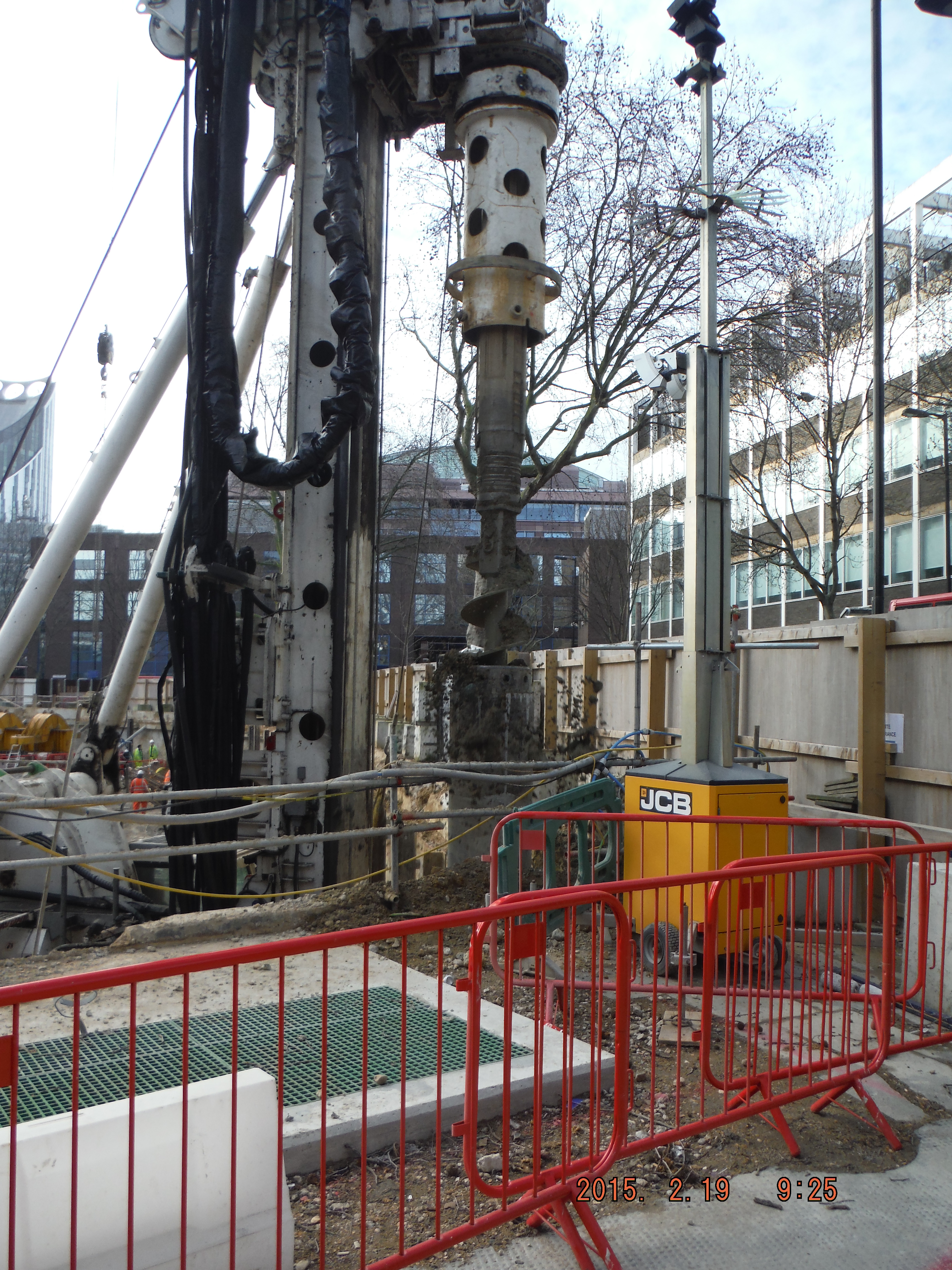 I arrived on site on 16 Feb and since then the focus has been on constructing the secant pile wall. The pre-existing site had one level of basement with an 800mm slab acting as the bottom prop. The slab is being used as the edge of the guidewall for the secant pile wall construction. The male piles, installed at the first basement level, extend to 26m depth through 6m of river terrace deposits and then into London Clay acting as an impervious cut off. The secant wall will act as a cantilever retaining wall when excavation to basement level 2 commences.