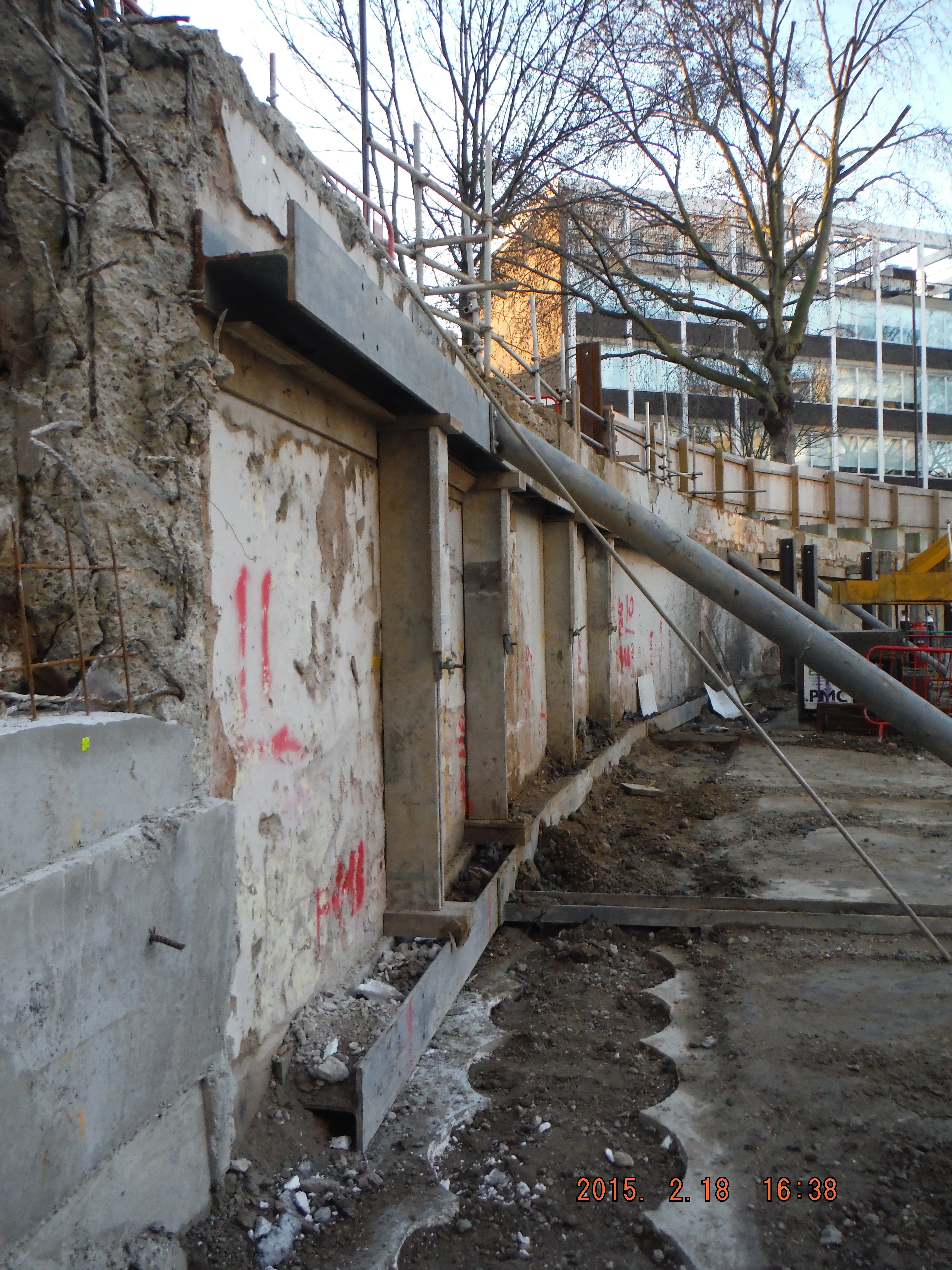 Now for the second part of the pun. After removing the pre-existing slab and some female pile heads it appears I have a floating wall. Well a wall being held up by lateral earth pressure resisted by the king posts and secant pile wall. The hole is about 300mm thick and 1.2 to 2m deep into the underside of the wall.
