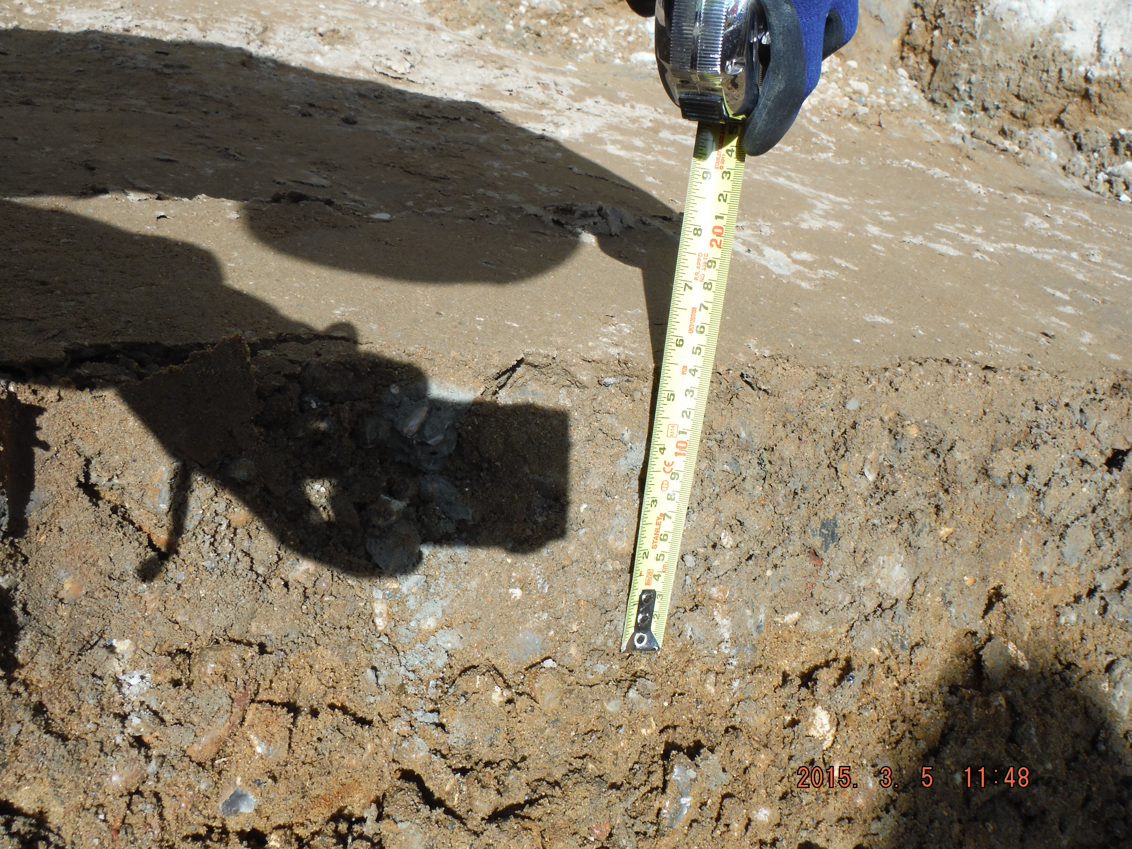 This photo shows compacted river terrace deposits. Rolled with vibratory roller – note depth of compaction – exactly 150mm @ 5 passes – as per the DMRB, now for the 6F2…