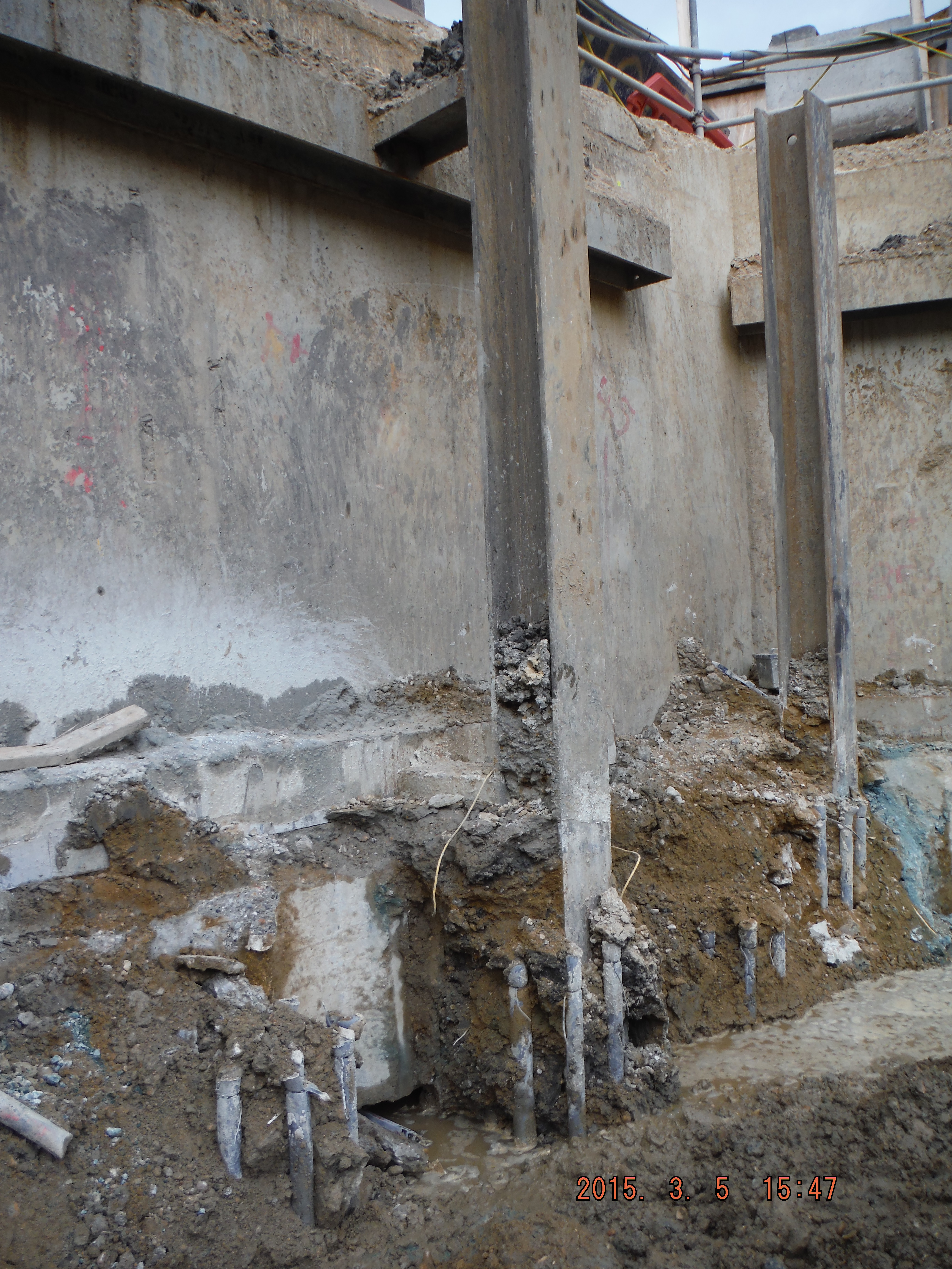 1. Pile Guide Wall (near ground) 2. Raking props to existing slab provide lateral restraint to existing wall (middle ground) 3. King Posts protruding from males secant piles to support existing wall (far ground)