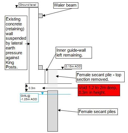 Cross section of existing wall and void identified above female pile which extends up to 2m underneath the wall.