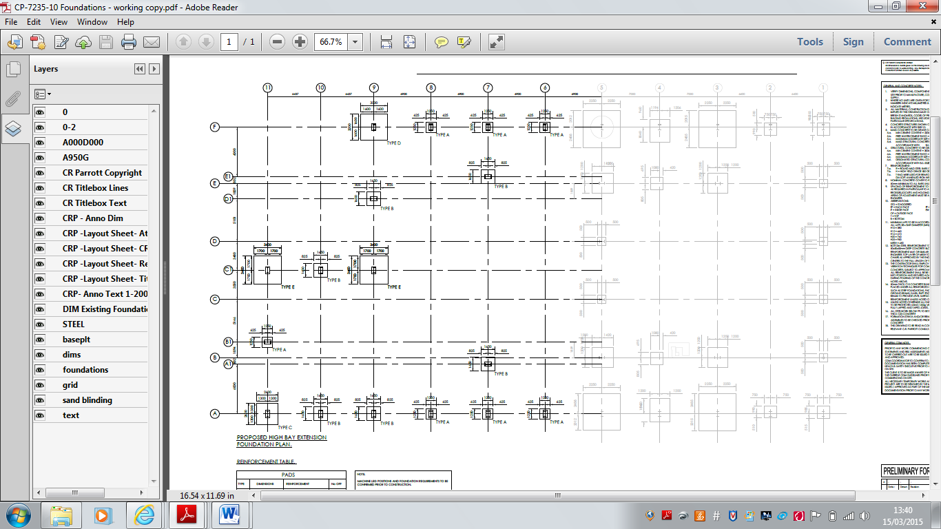 The first stage was to take the existing building footprint and set out the new nodal positions and detail appropriate section sizes based on the original frame as the steel section design information was unavailable. I had however received the loads from the steel designers, as nodal loads, (which made life easier) and allocated those to the frame accordingly. I made an adjustment to the surcharge load from the original due to a different slab requirement and dug out the original site investigation report to ascertain the ground conditions and safe bearing pressure of 225kN/m3. This indicated a layer of chalk at 1.5m from the underside of the slab and I decided that this would set the depth of my foundations. Once these parameters were established I individually designed the 16 foundations required before economising the design for ease of construction by reducing this to 5 different sizes. Partly due to the specified depth, I was able to negate the use of steel in the design and recommend the bases were constructed from mass concrete, thus reducing the cost. Once complete I submitted the design to the Senior Structural Engineer for a few tweaks before detailing the drawing in AutoCAD and sending to the client for discussion and approval.