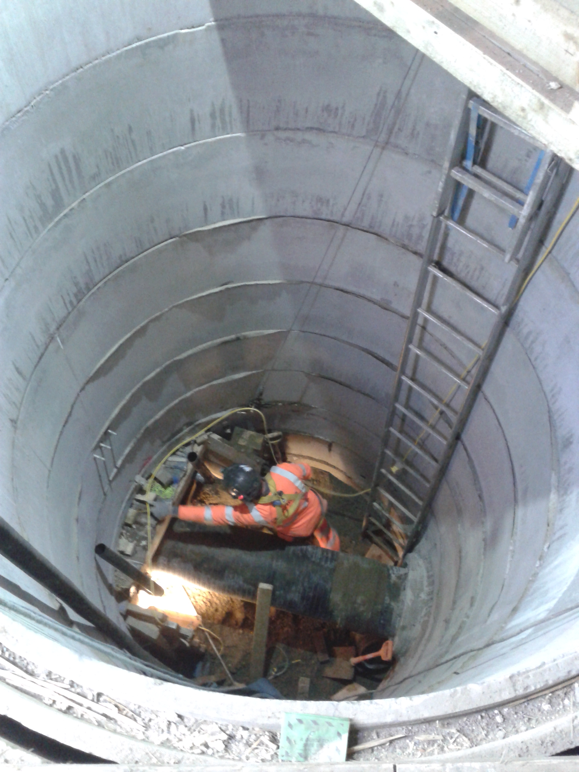 The group would also be installing drainage so I explained the Carillion policies on permits to disturb the ground and safety in excavations. I took them to view the final processes of the infamous micro-boring that has finally connected the foul drainage to the Thames Water trunk main. As I left Battersea they had just uncovered that the trunk main was too close to the Battersea Park Road bridge for them to retrieve the microboring machine. The team from Barhale ended up having to recover it from the Network Rail arch that runs underneath road. They constructed a steel girder gantry (see picture) over the reception pit to recover the machine and push it out of the arch using a miner’s railway track. Thames Water would not allow them to tunnel directly into the old Victorian sewer using the machine so the last few meters were completed using a traditional timber heading with soil grouting and de-watering. The total cost of the operation is now likely to exceed over £1m and is almost 4 months later than the planned completion date.