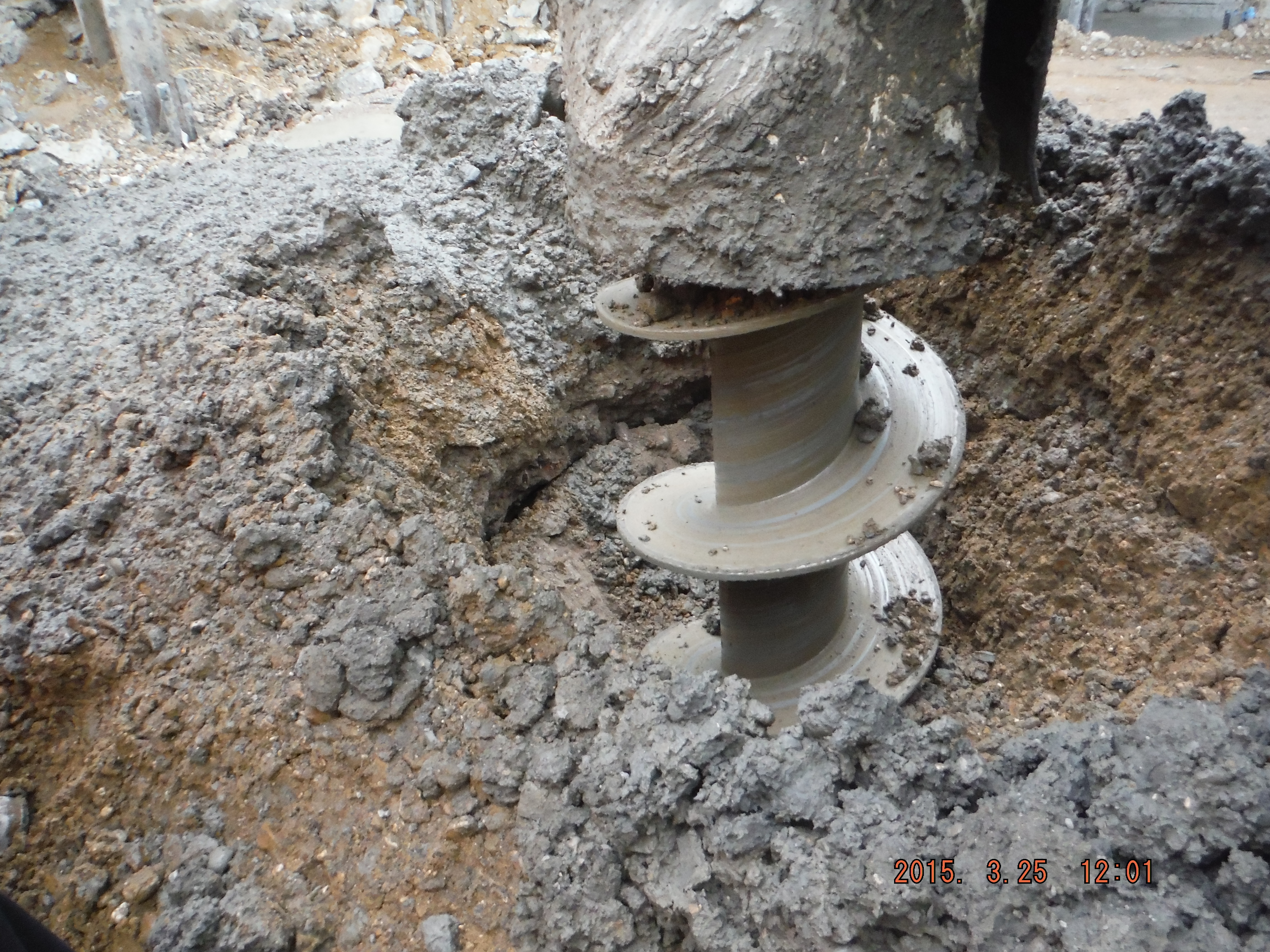 Take 3. Auger is drilled in and at about 20m embedment the extracted material from the pile drops into the ground. The foot at the bottom of the pile rig mast was starting to get undermined and so the drilling was stopped and the auger retrieved.