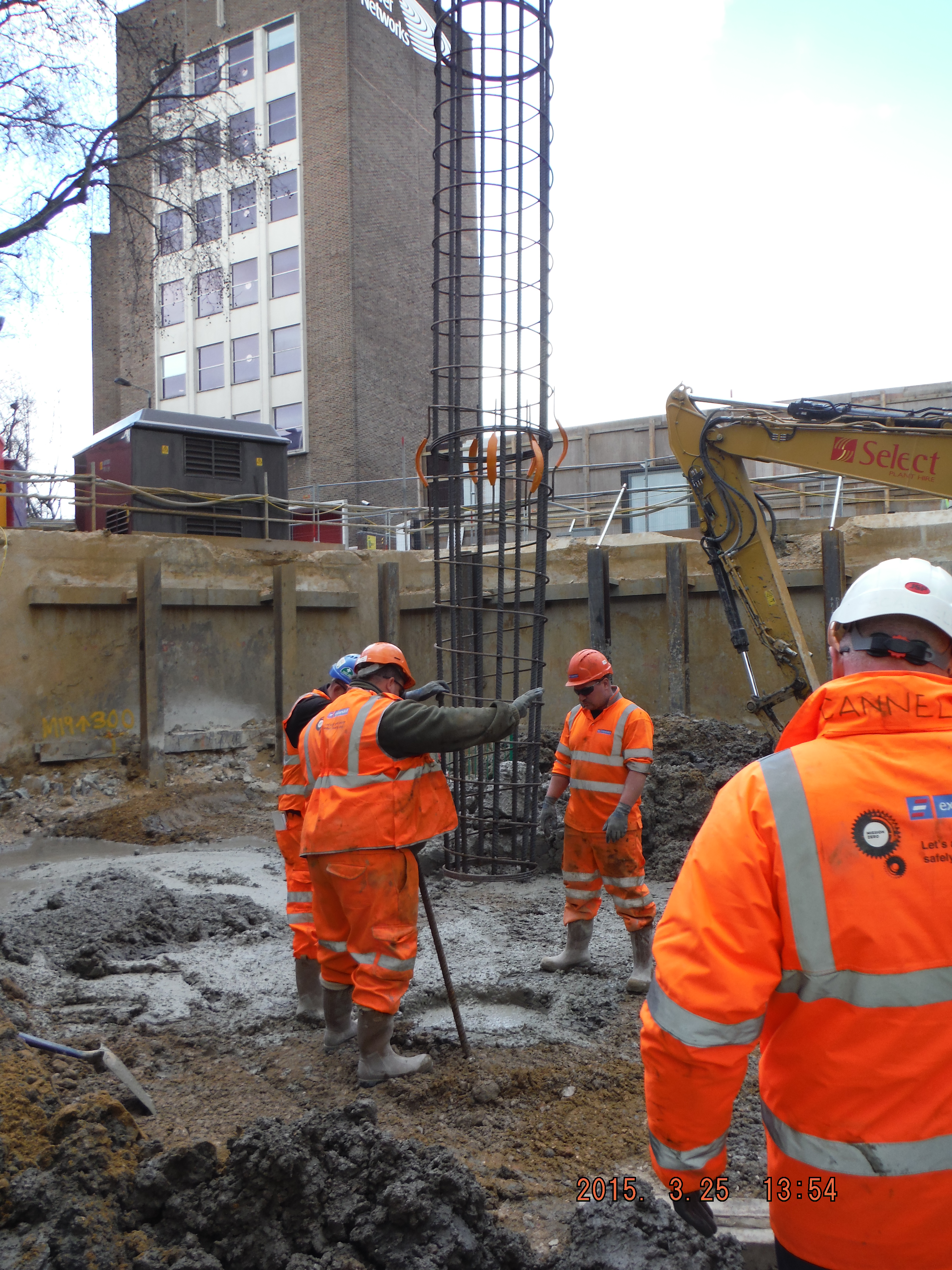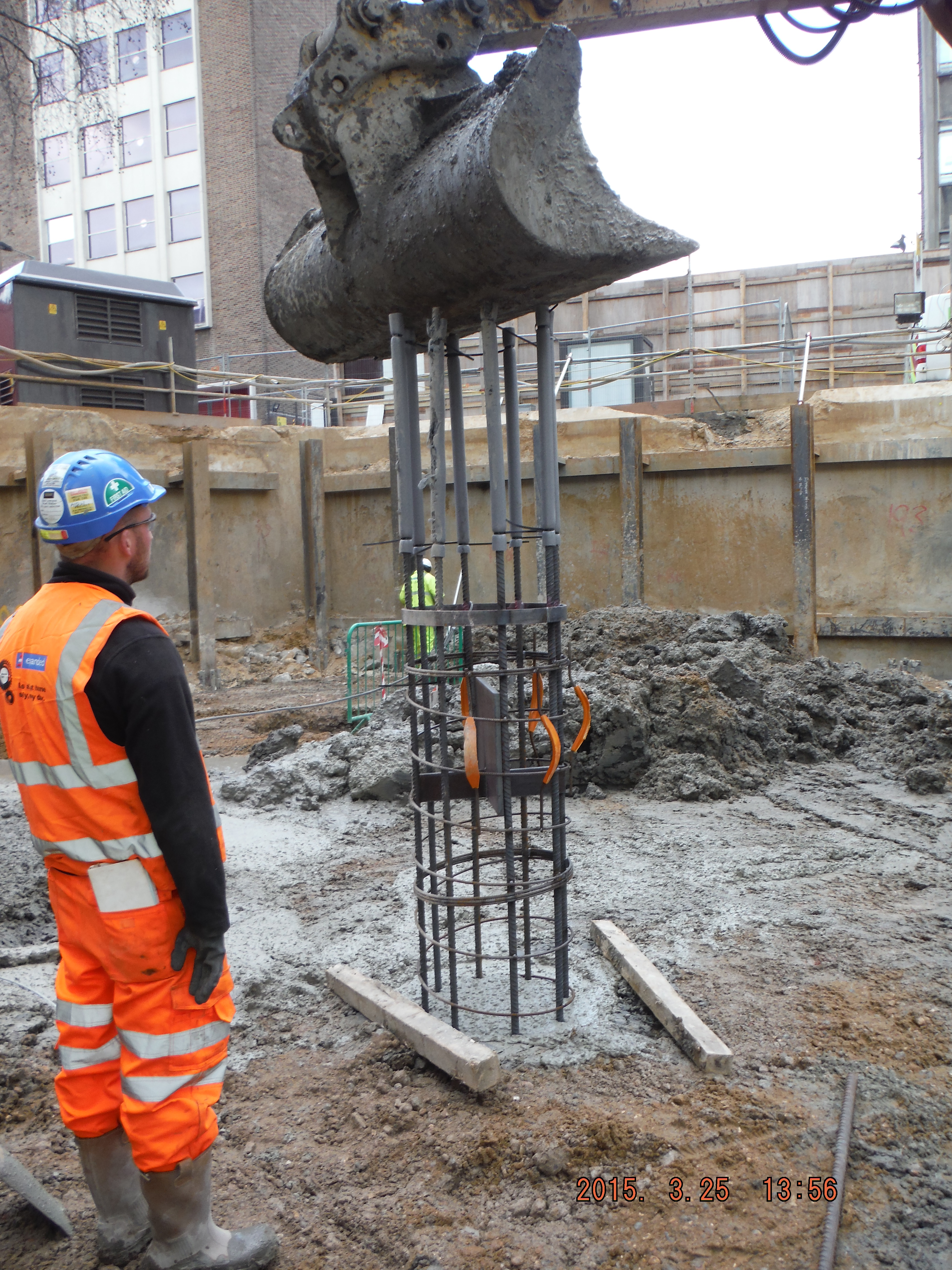 Take 2. The next ground bearing pile was approached in the same way. Auger goes in, no blockage, concrete comes out and auger extracted. Nice vertical concrete pile. Then the reinforcement cage was added then it was pushed into the pile with an 8.5m column to sit the cage at the right cut-off level. This was in order to avoid breaking down the pile with reinforcement in. Everything great.