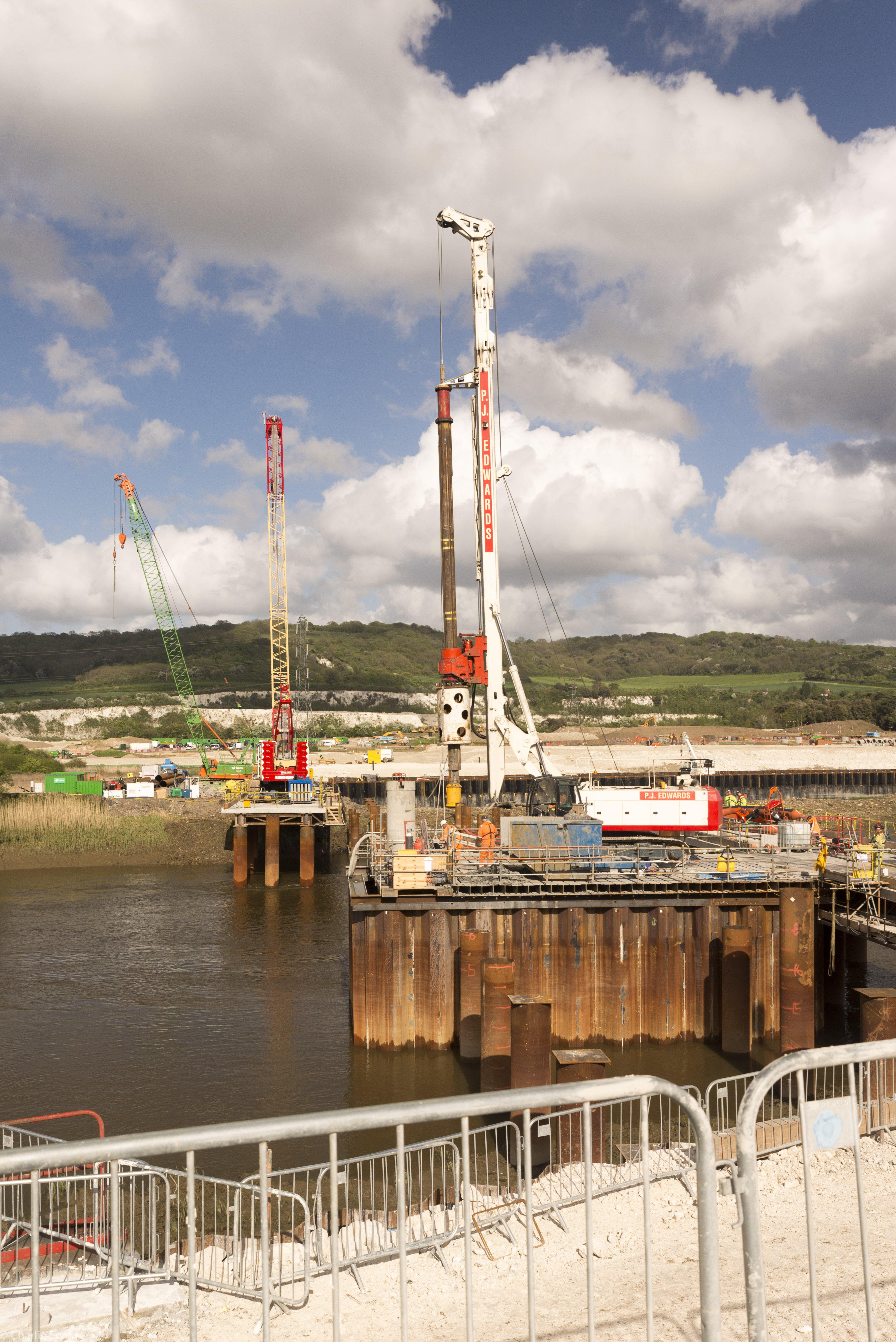 Working on top of the cofferdam has caused a few logistical problems, there is no space to store any equipment and the spoil has to be spun off in to a skip and then craned on to the land which slows the whole operation.