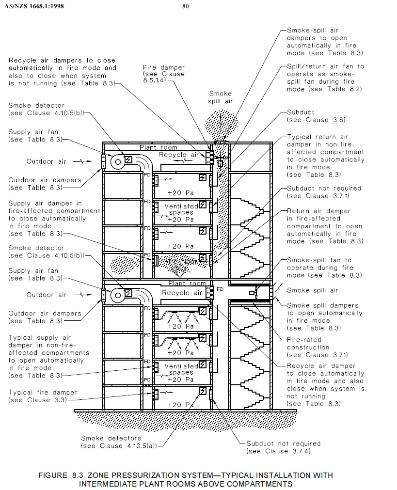 However this diagram (from the AS/NZS1668.1:1998) does explain pictorially how the two systems work together including what each type of damper should do in the event of a fire dependant on if the damper is in the fire-affected zone or not – this is indicative of building layout in the PCH project having plantrooms between levels.