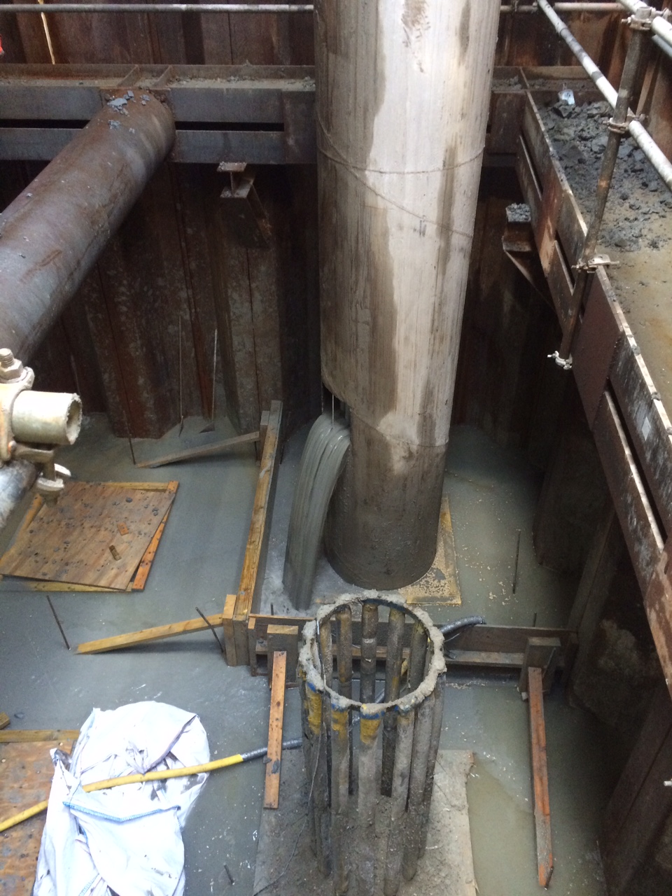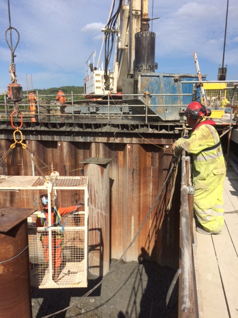 The casing starts 1m above the deck and drops 8m through open space and a further 5m into the ground of which 3m is toed into dense clay. The first problem this throws up is that the pilers can’t see the ground level down the shaft, to resolve this issue they have cut a window in the casing above ground level that they can look through from the base of the cofferdam. This window also acts as a water escape when the concrete is being poured allowing us to capture the spill in the dam. It also allows us to monitor the concrete to ensure we are not over filling and creating a large mess (7m3) when the case is pulled.