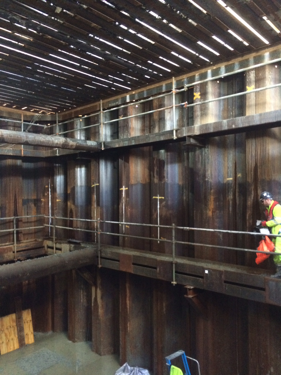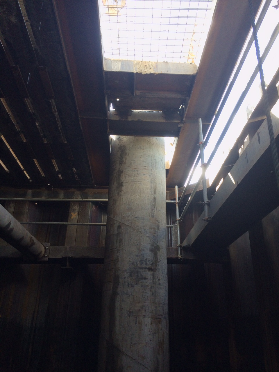 On a slightly more technical note I have spent most of today trying to work out if the sheer pile wall will fall down if I take a corner prop out. The prop is really bent. It was hit by an excavator during the dig. It’s meant to be straight and connected to the capping beam each side by a plate and some fairly serious bolts. Since the beam is as bent as it is, I think that it’s load bearing capacity will have been severely reduced. Which temporary works are designed to withstand impacts, this was a big one. Look at the deflection! Additionally it would appear to have lifted away from the capping beam at each end, so isn’t in proper contact anyway. Also the inclinometers, prisms and google maps so no movement on the sheet pile walls. So I think it isn’t really carrying any load. However I can’t prove it. And without an ability to prove it, no one will take the risk on taking it out.