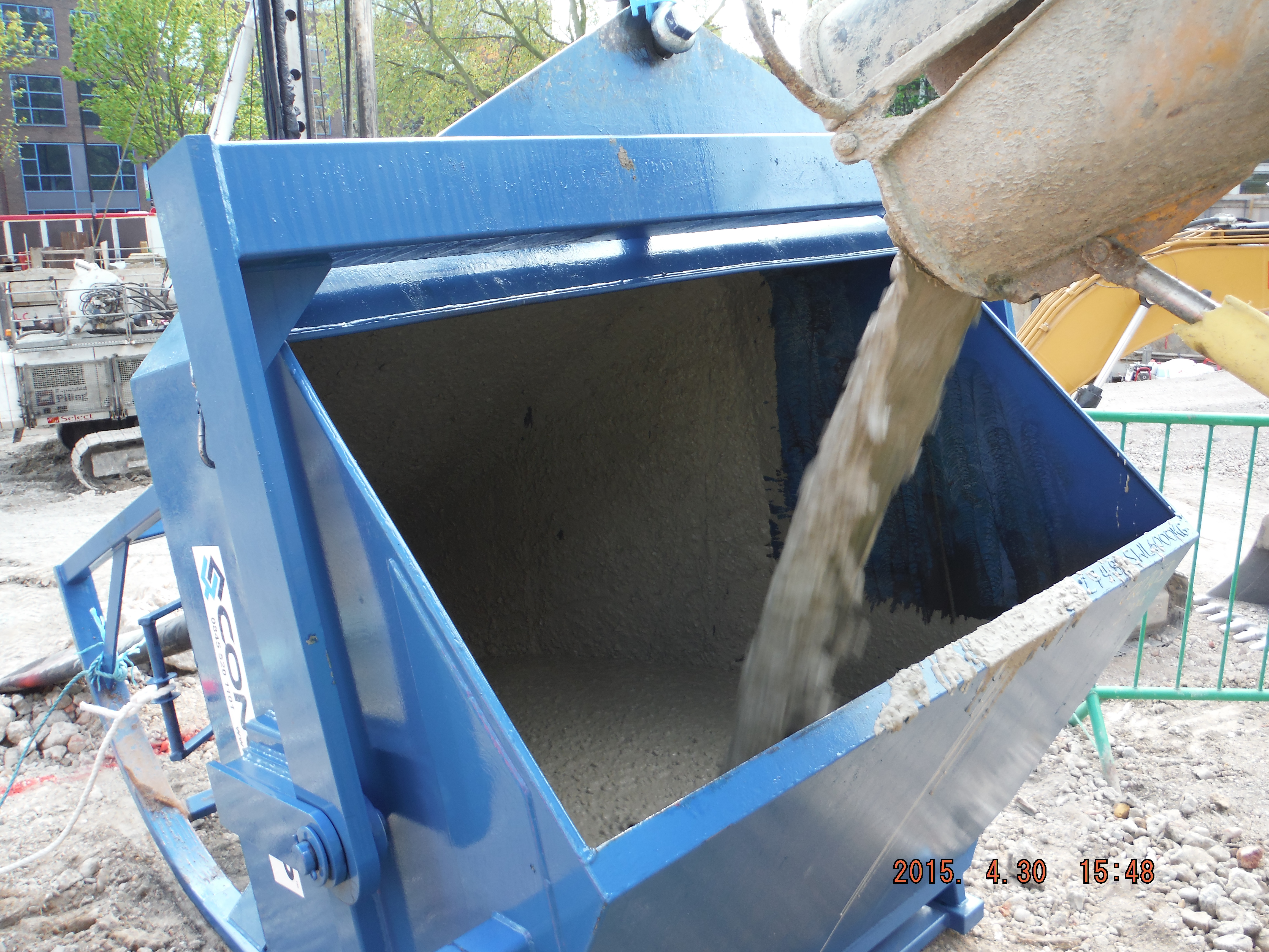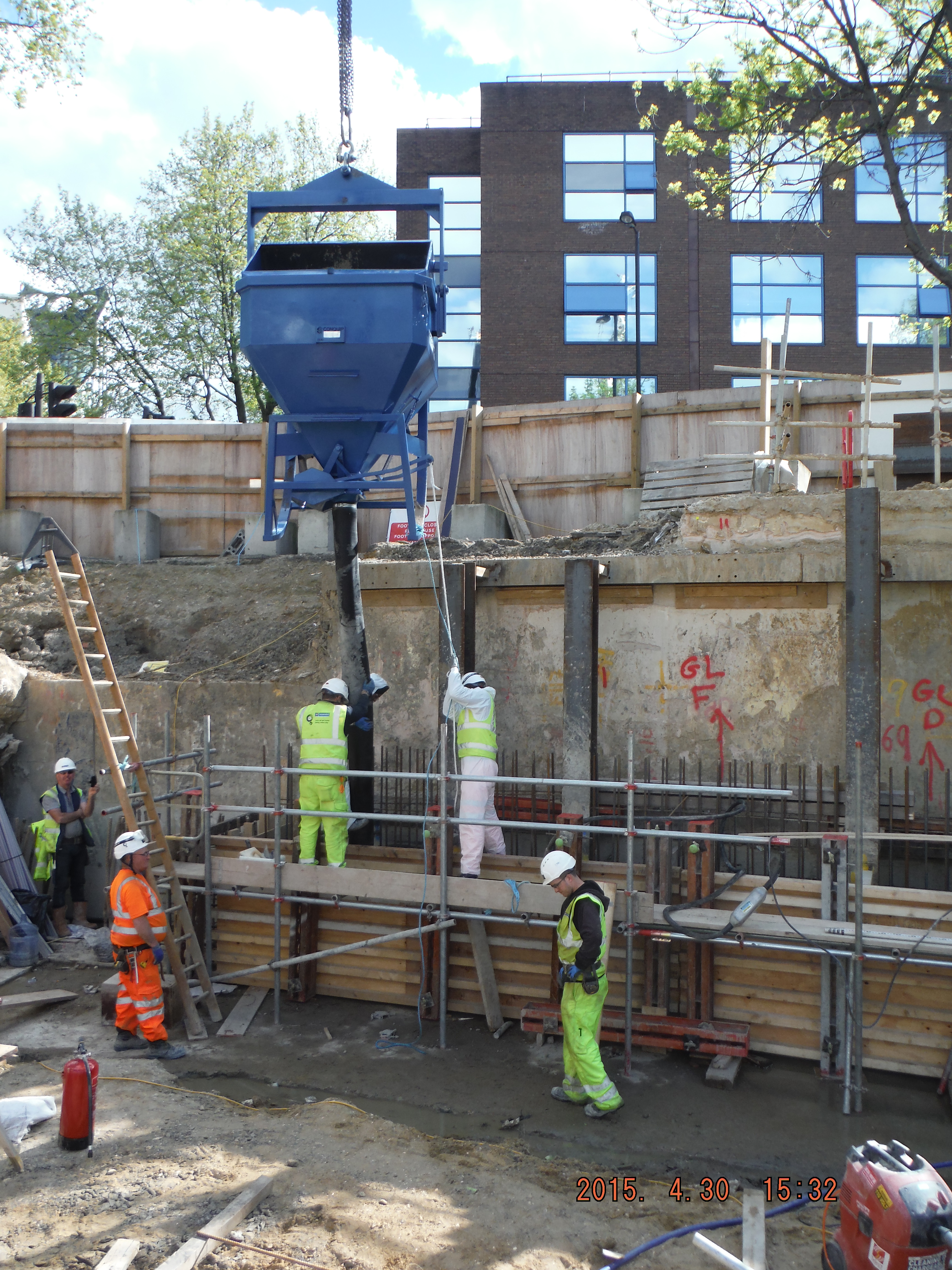 Delivery method. The method of delivery was via a rolling skip with tremie pipe and crane. This was used because 1. The crane was available, 2. There was no space to get a concrete wagon or excavator near to the beam.