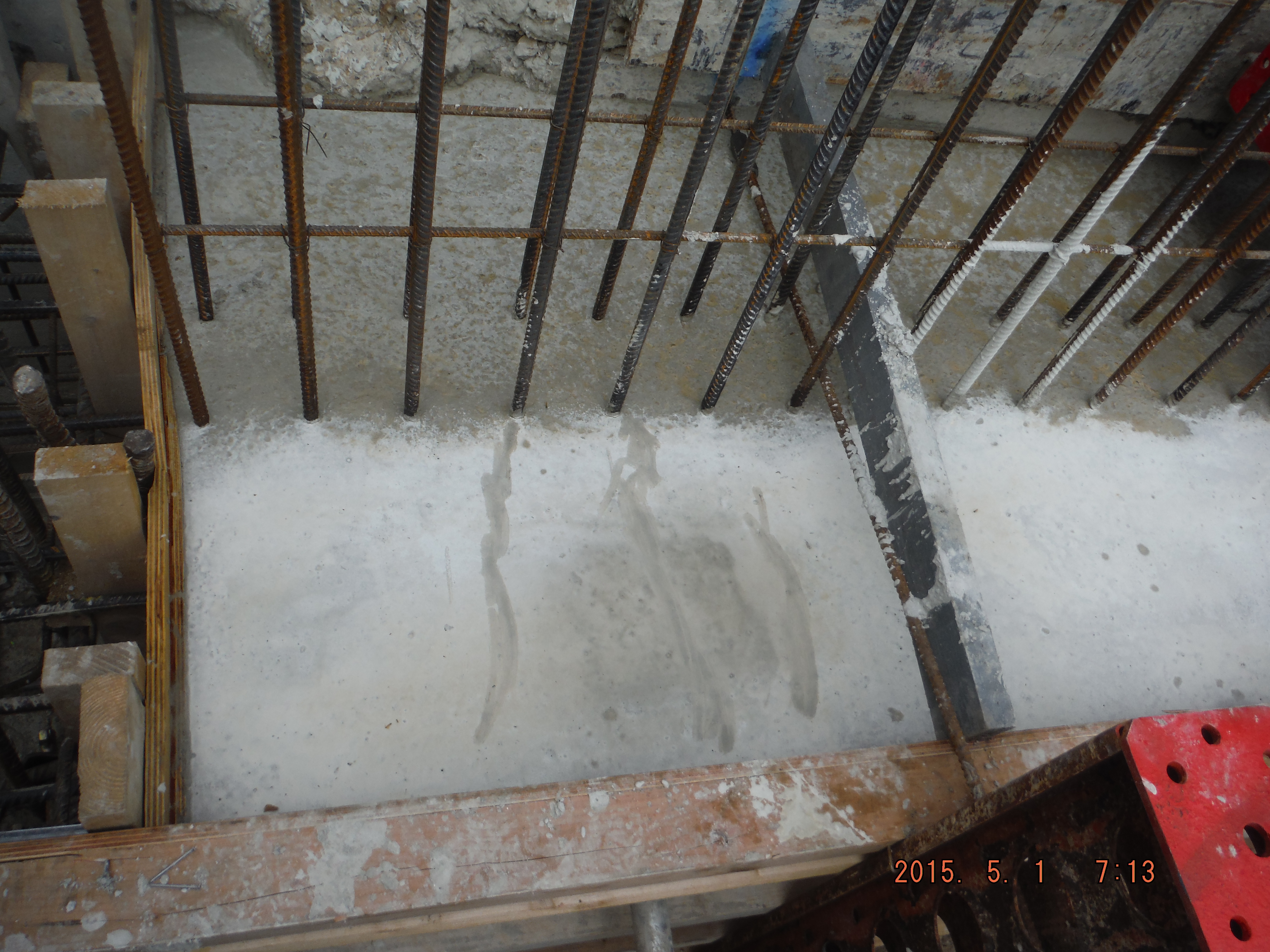 It is likely non-structural cracks will form (which cause durability issues because of reinforcement corrosion) within a day of the pour. The cover has been set at 55mm which means the as cracks reduce in width with depth, the reinforcement should be protected. Applying curing agent to the beam aims to protect it from rapid drying out of the concrete and therefore reduce cracking. Before hardening of the concrete plastic cracks may well form due to either plastic shrinkage or plastic settlement. It looks as though plastic settlement around the reinforcement due to “bleeding” (water rising to the beam surface shortly after compaction due to heavier mix constituents moving down due to gravity) has already occurred, although very minor at this stage.