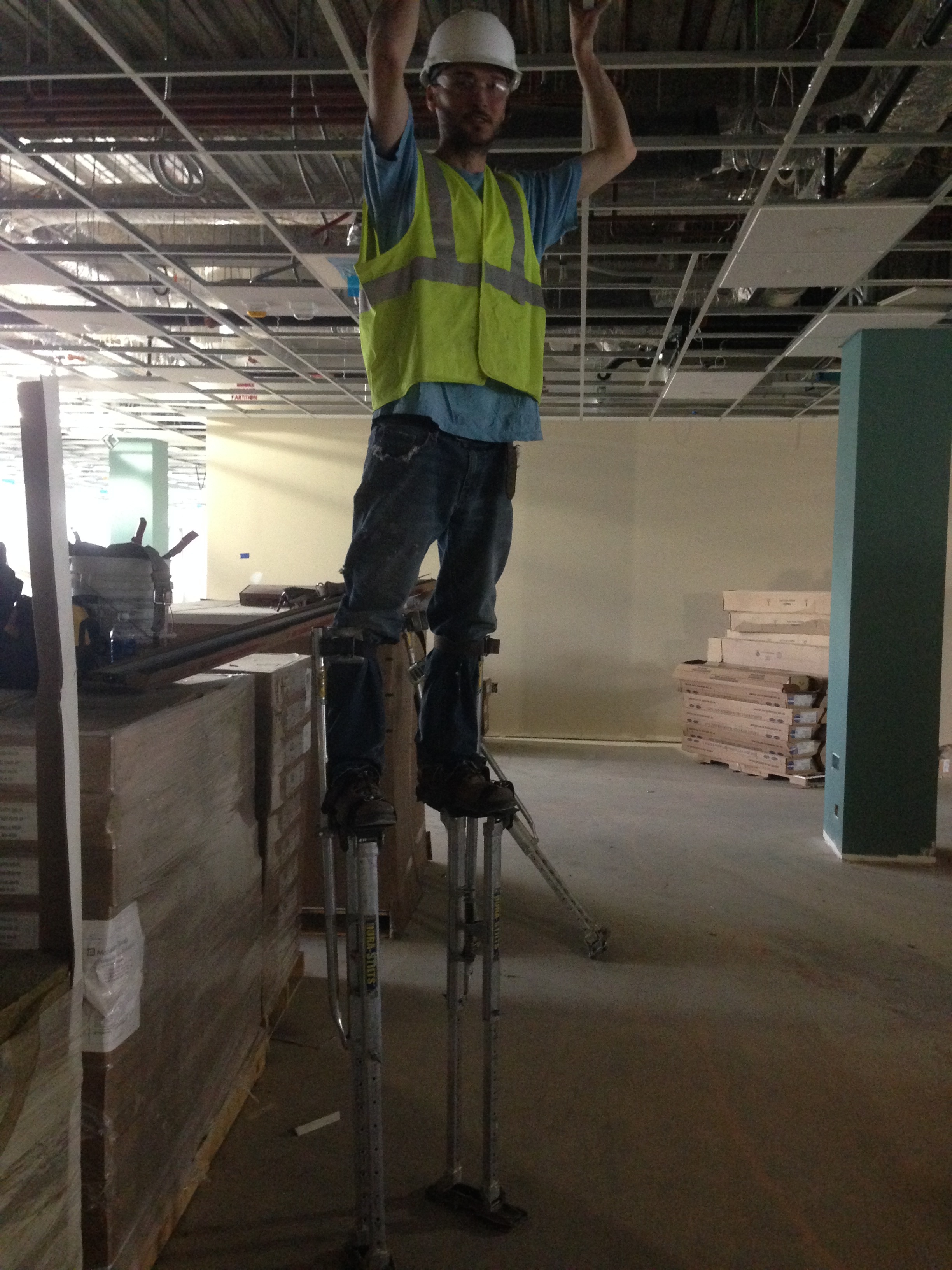 Firstly I was just shocked by this entirely logical solution to working at height: stilts! They appear to be incredibly useful for fitting ceiling grid and both plastering and painting the tops of walls. They give the users freedom and flexibility to work and apparently are quite easy to get the hang of.