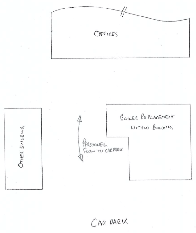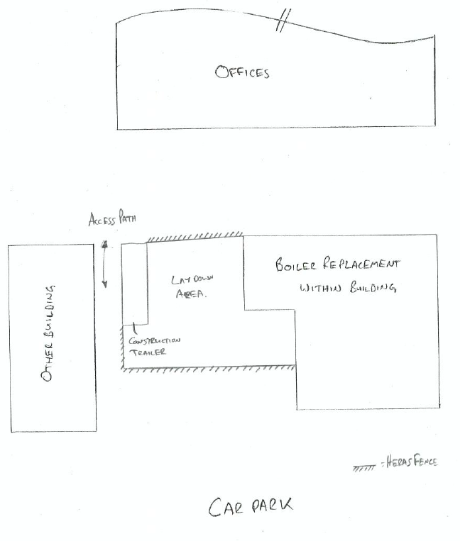 The project is quite small and all of the actual engineering will take place inside the building, which is a plant room, so in terms of danger to the public it is not immense. However there will be deliveries, a lay down area and probably some work such as metal cutting done outside of the tight confines of the plant room. As people will, twice a day, walk to and from their cars through the site it seemed sensible to enclose the whole site with a fence to protect people from these dangers and themselves.