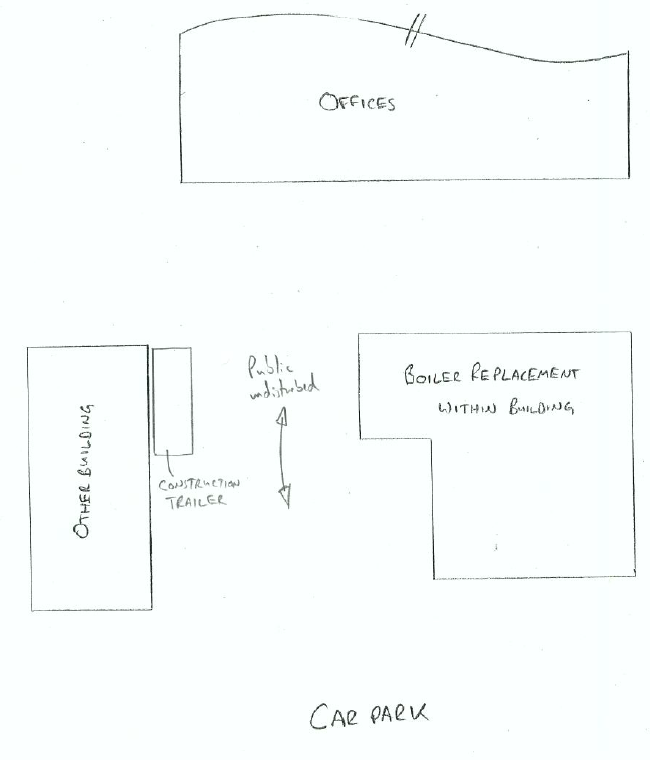 Secondly, it is commonly known that people are simultaneously stupid, curious and lazy. Therefore it makes sense to fence construction sites to shepherd people into areas of safety and away from all the things that mean we require training, site briefings and PPE when we enter a site. Below are 4 very crude layout sketches of the Fort Indiantown Gap (FIG) boiler replacement site showing: the current site, the contractor’s ‘plan’, my plan and the compromised solution.