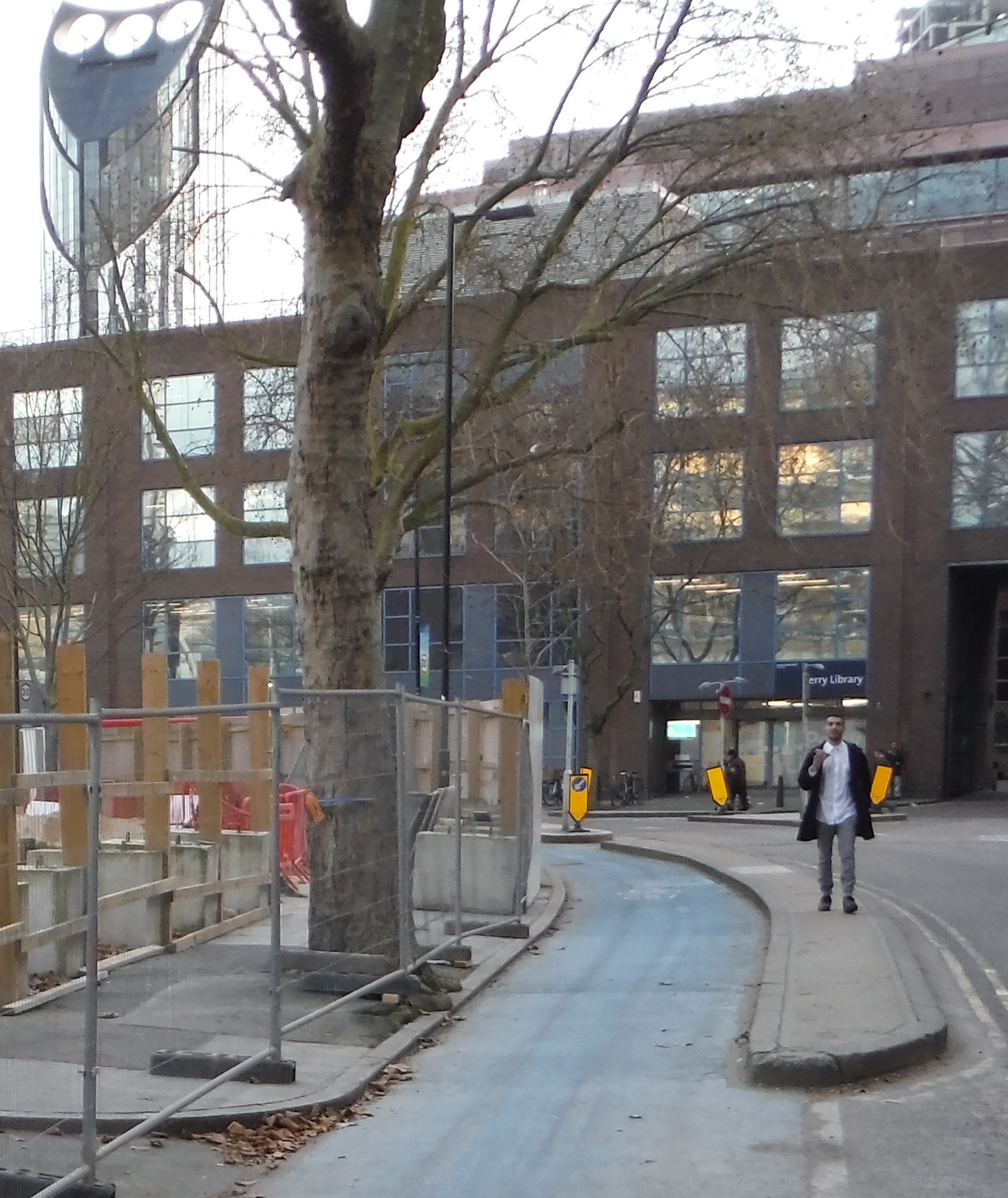 Left – See concrete blocks with posts on – this is the original hoarding line. Right of tree – see blocks moved to edge of pavement, tree will now sit “inside” the site.
