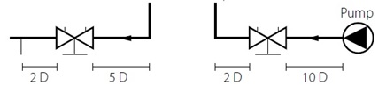 However, checking the valve manufacturer, Tour & Andersson’s (TA), data sheet it stipulates the valve must be installed at min straight length of 5 x dia upstream (10 x dia if connected straight to a pump) and 2 x dia downstream of the valve, as shown below.