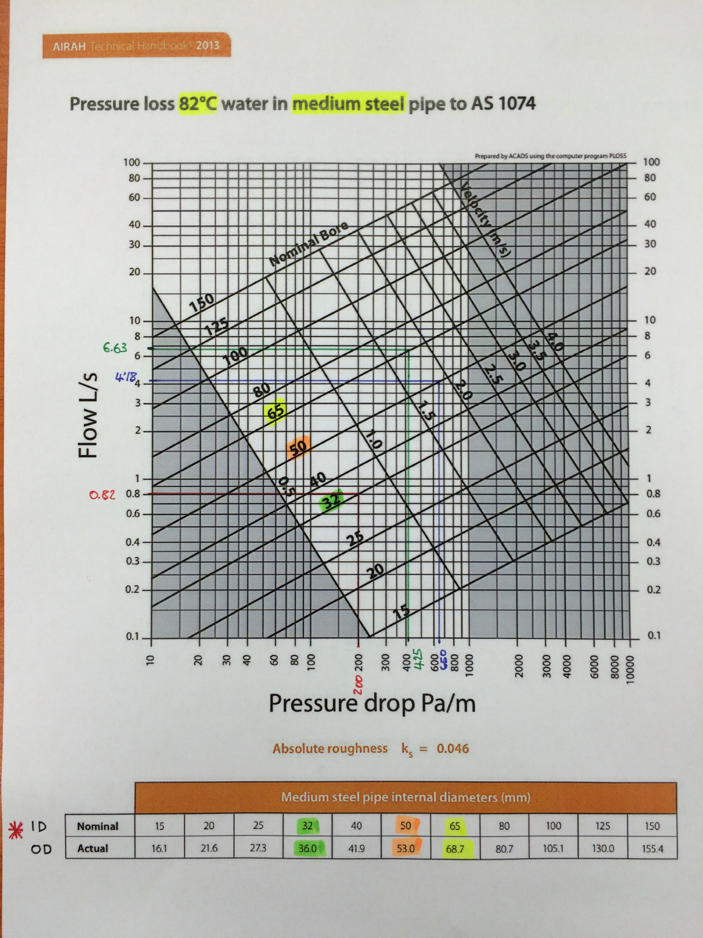 However, they should have also realised that steel’s actual internal dia is larger than the stated nominal size compared to copper’s actual internal dia which is smaller than the stated nominal size (copper’s nominal dia is almost akin to the OD (external dia)). This can be seen from the internal pipe sizing table at Table 4.2 CIBSE Guide C and the AIRAH charts below. This comparison is the same for both the UK and Australian construction industries, however, AIRAH present their charts with both materials having the same nominal internal dia and this is what caused the confusion resulting in the errors. NDY designed the pipe networks using steel pipe (e.g. 32mm dia gives 400 Pa/m) but when Fredon changed material to copper they simply used the same 32mm dia pipe. But a copper 32mm nominal pipe has an actual internal dia of 29.26mm which is smaller than the steel pipe’s nominal dia of 32mm (actual internal dia of 36mm) hence over a 6mm dia difference which creates higher pressure losses.