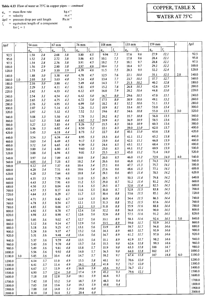 Therefore, if the schematic shows; Copper Ø 65 mm, at a flow rate of 6.63 l/s and velocity of 2.3 m/s the AIRAH charts gives a ∆P = 575 Pa/m.