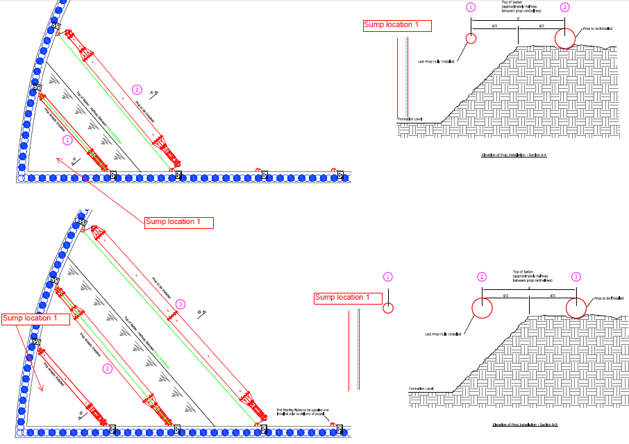 Method of excavation shown here in stages but sump 1 overlaid. Not risk of slip failure reduces as dewatering continues because of improved effective stress.