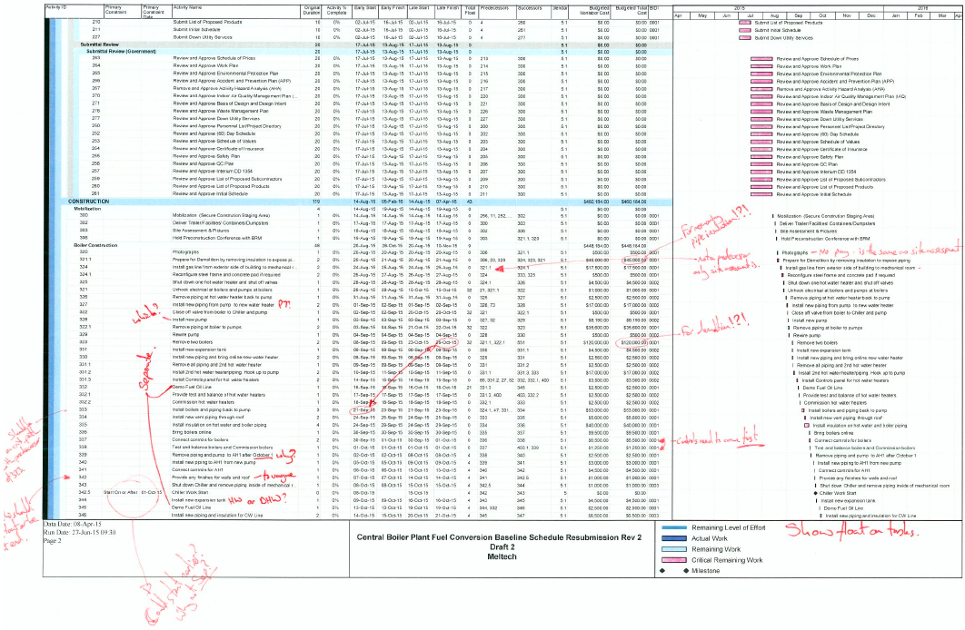 Another element of the meeting was to review some of the contractor’s submittals that required changing and this included the project schedule. Fig 4 shows my copy of their schedule prior to the meeting. It is probably difficult to see all the detail but the best part is where the contractor has claimed a value of $120,000 for boiler removal and $45,000 for insulation removal, bearing in mind this is a $500,000 contract. The boiler removal will require skilled personnel and some Materials Handling Equipment (MHE), but the insulation removal will just be Spr Crosby with a knife and a bin; so $4,000 and $1,000 might have been more appropriate. When confronted as to why the project manager, without a hint of shame, said: ‘That’s frontloading.’ I’m not sure whether Steve Payne would be proud or ashamed of him but, needless to say those figures will be adjusted.