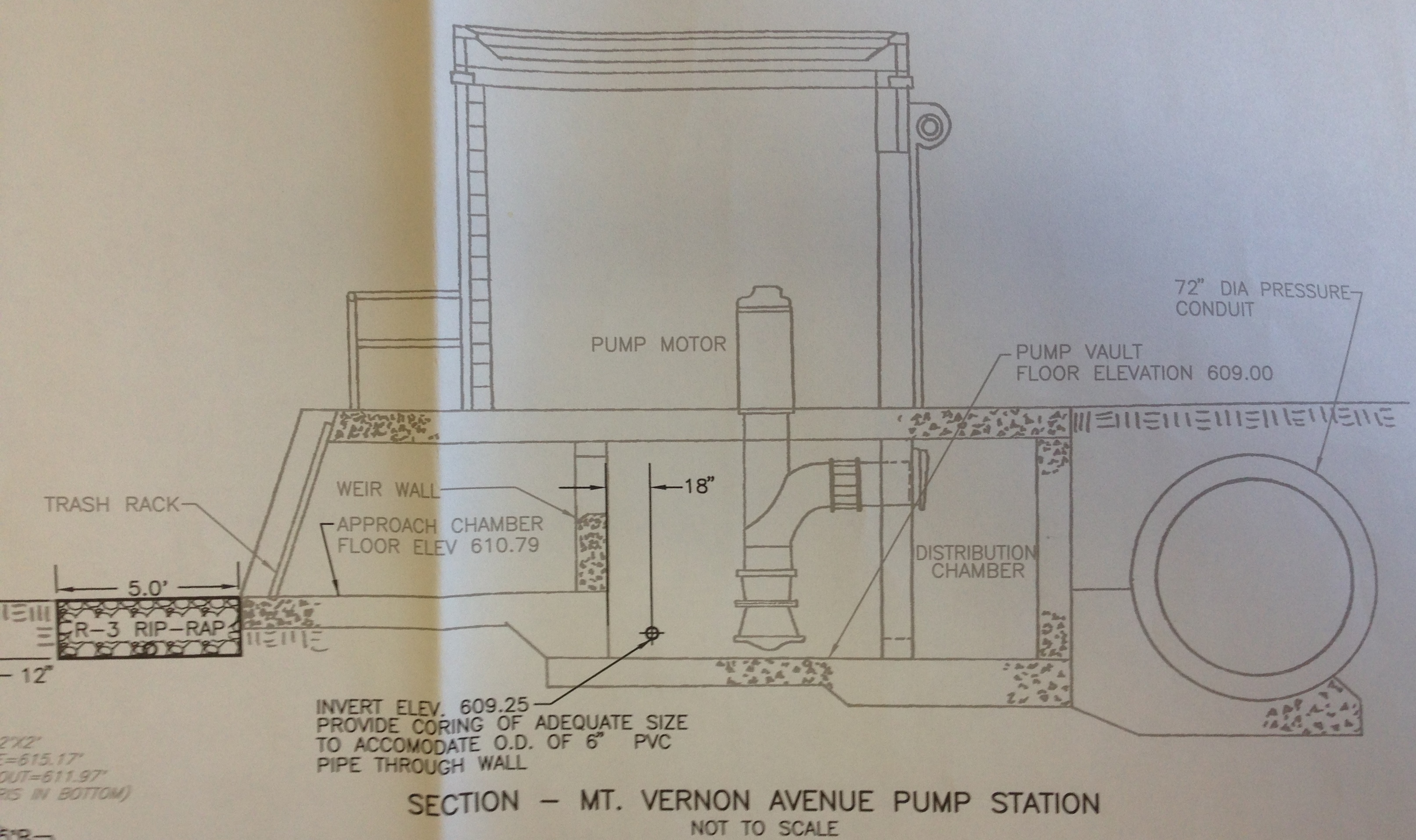 The systems we inspected were built from the 1940s onwards and were simple and robust in their design using, as one would hope, gravity where possible. There were a couple of pump stations with standby generators where gravity had to be overcome. As the drawing shows below a lot of effort is taken to remove the debris and sediment from the flood water to protect the pump and prevent it clogging the pipe work (or pressure conduit to use the vernacular).