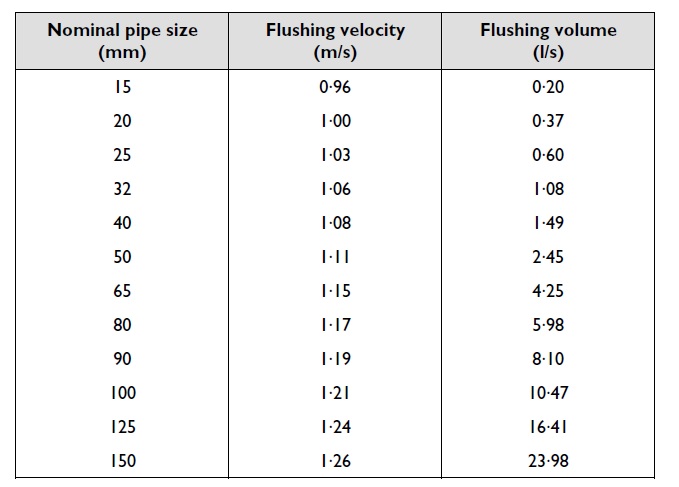 The specified minimum flushing velocity should be that indicated in the table (figure 1), or the design velocity plus 10%, whichever is the greater. The flushing velocity must be selected based on the largest pipe size in the system or circuit to be flushed.