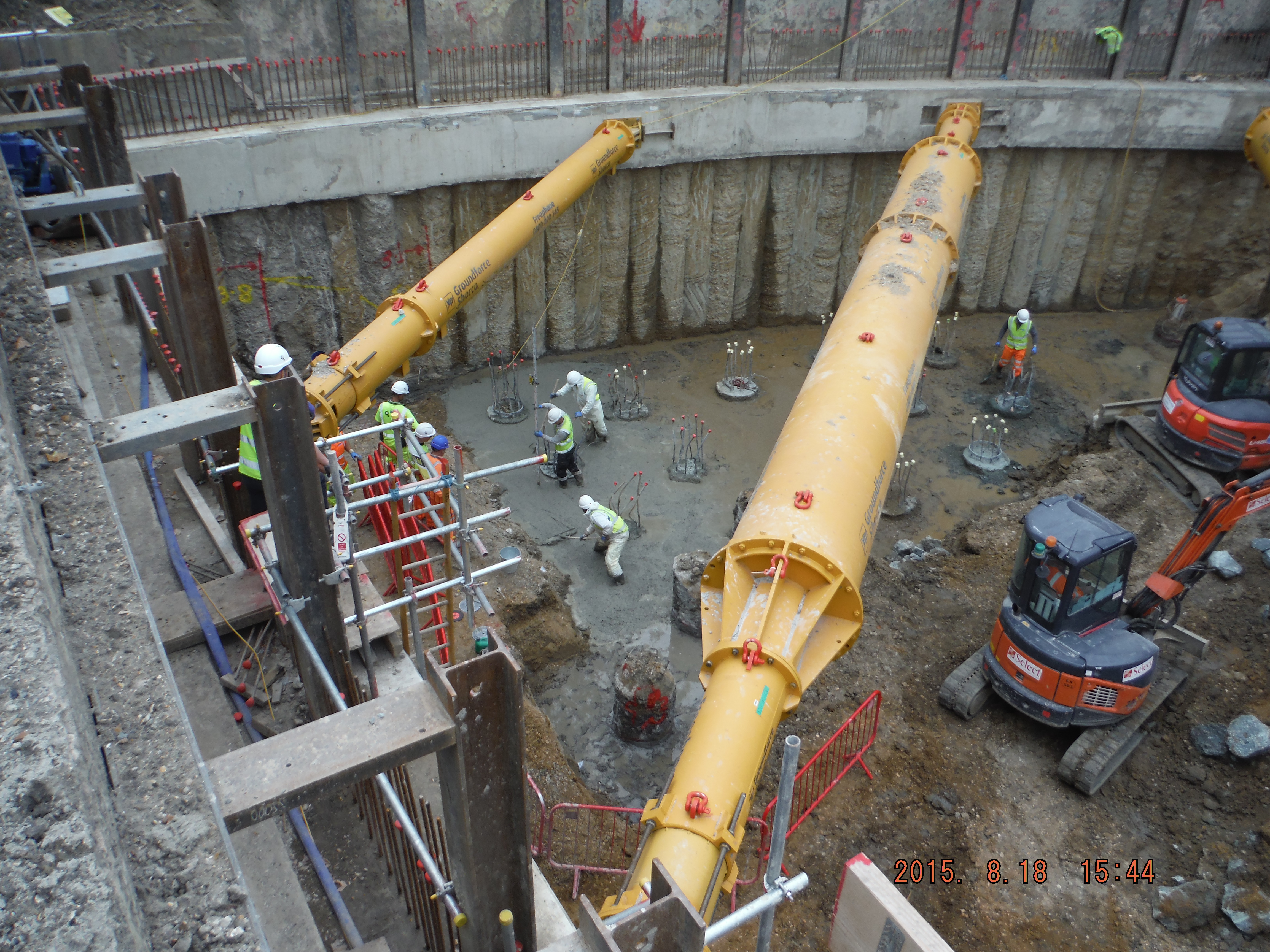 Capping beam fully loaded by props. Excavation needed to get going to prepare ground for raft slab pour.