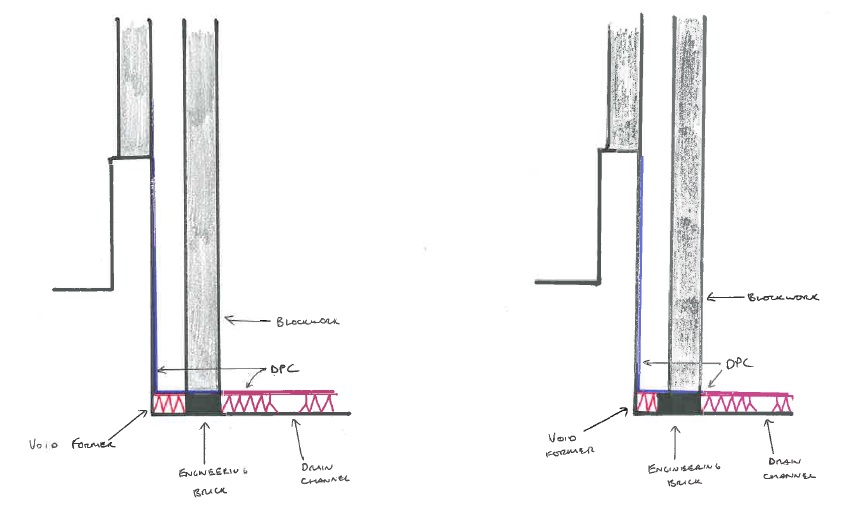 The bottom of the inner skin is sat onto engineering brick. The bricks are 205mm long and the blocks are 140mm wide. Therefore the bricks were to be cut down then laid side by side (as opposed to end to end) to give a 140mm strip to lay the blocks on. At the base of the cavity there is a void former that the dpc runs over the top of. So why are we cutting the bricks down? Cutting the bricks would cost more and take longer, and you also have to pay for more void former. I suggested laying full bricks to the architect and he was happy for us to do so, as was the waterproofing designer. So why did the additional design call for the bricks to be cut? Because the architect thought the drawing looked neater. I wish I was joking.