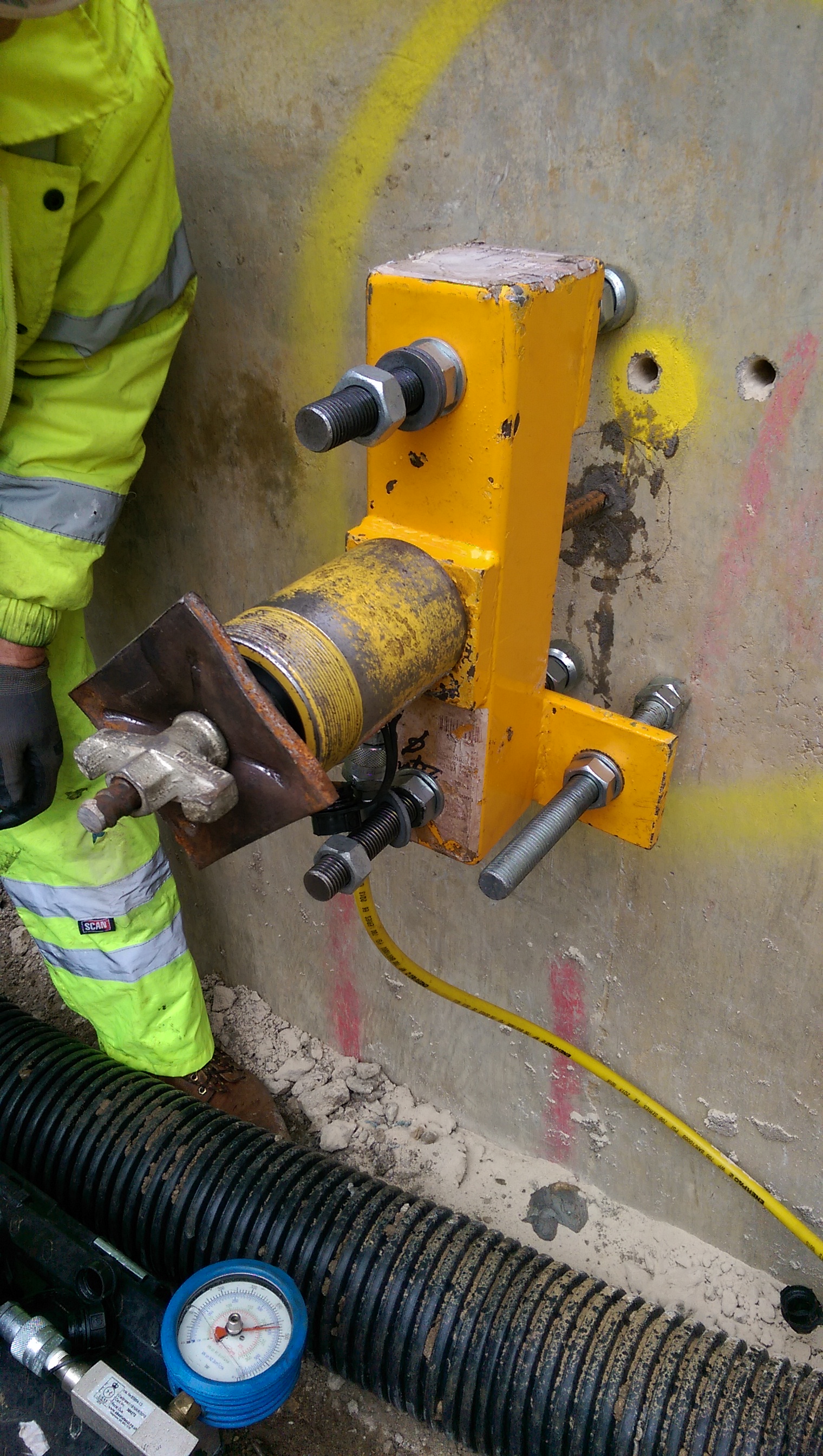 Pull out tests. We want to use an existing retaining wall to resin in dywidag bars to connect a one sided shutter to form a new retaining wall. We will be using Peri shutters with pre-set tie bar positions. The pull out tests showed no movement at 150kN, other than a bit of feet penetration into some old plaster on the wall. At 150kN there was a crack sound as the resin slightly debonded from the concrete and at 200kN there was evidence of some a cone failure (see circular crack around bar). The aim was to confirm a 90kN force would not be exceeded which the tests proved was the case. Interestingly the critical factor in pouring the walls will now be the pressure on the formwork soldiers and walers, rather than tie force. Therefore the rate of rise will be controlled especially because we have retarders which increase the pressure exerted on the formwork.