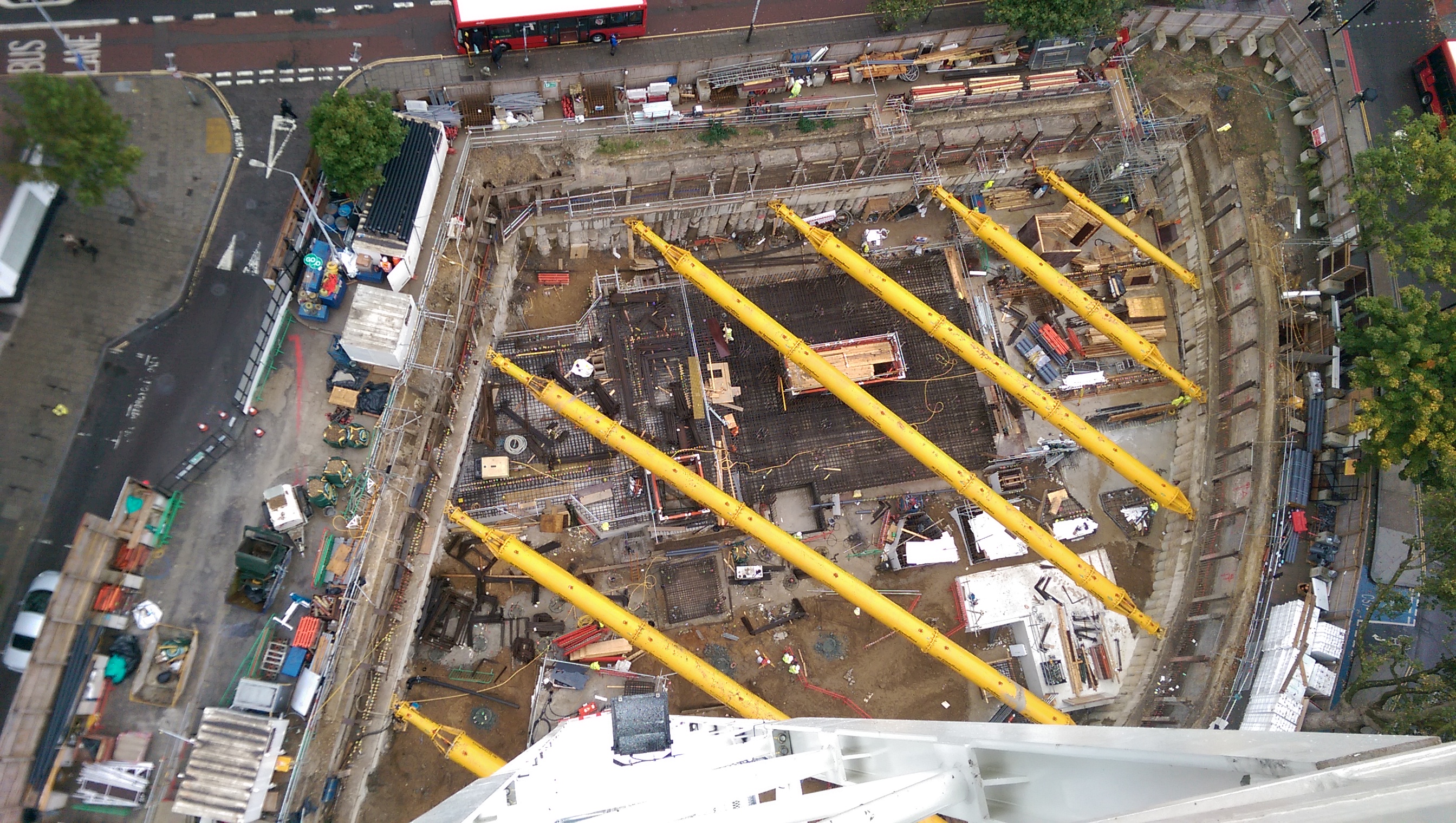 The propping scheme in my mind is a mistake or an oversight by us. The only slight advantage of this simple solution is that the straight (top of the photo) section is well braced. This is near to the northern line tunnel which has movement limits on it. We have seen about 8mm of deflection between props where 15mm is allowed, so perhaps greater spacing would have worked.