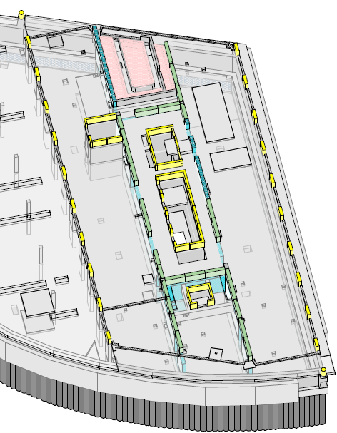 Substructure – The green walls represent the shear walls in the tower. Inner yellow walls demote lift pit and stairwell.