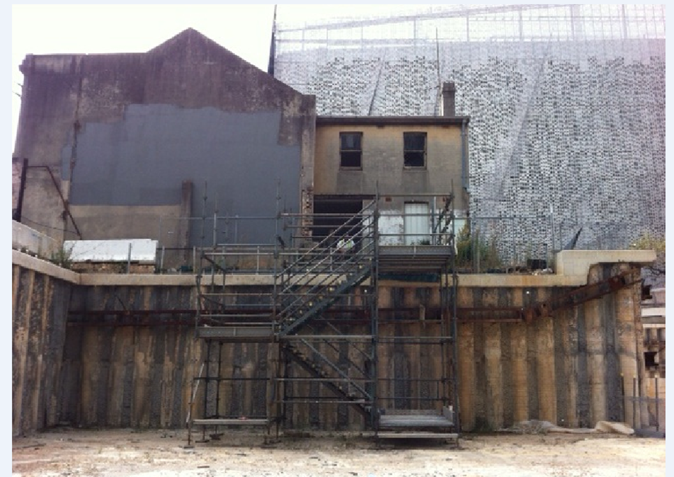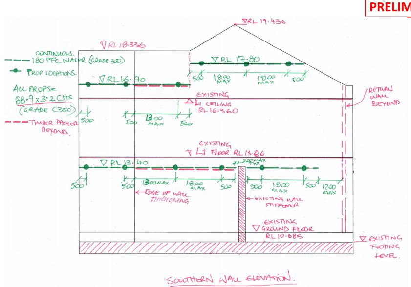Several methods of reinstating the structural integrity of the building have been investigated but due to the time it takes to gain permission to do almost anything inside a heritage building, the level of internal instability between floors, contractual complexities and more – a temporary external fix has been selected. The solution involves three levels of walers being attached to the wall and then braced by a series of props. The solution is illustrated in Figure 2 and Figure 3.
