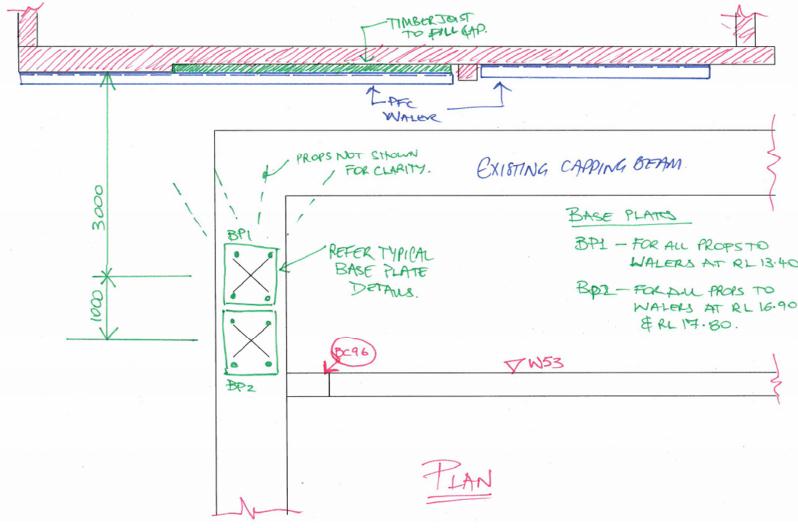 The hashed areas are (temorary props option 2) the struts shown are the existing props. Option 1 would see them replaced by 2 props in each corner off the capping beam.