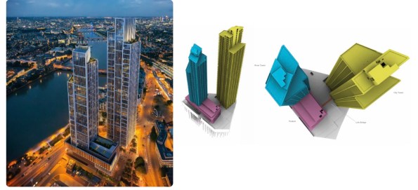 Fig. 1 Architects Impression (Left) and Superstructure 3D (Right) – notice the lack of St George Wharf completed in 2014