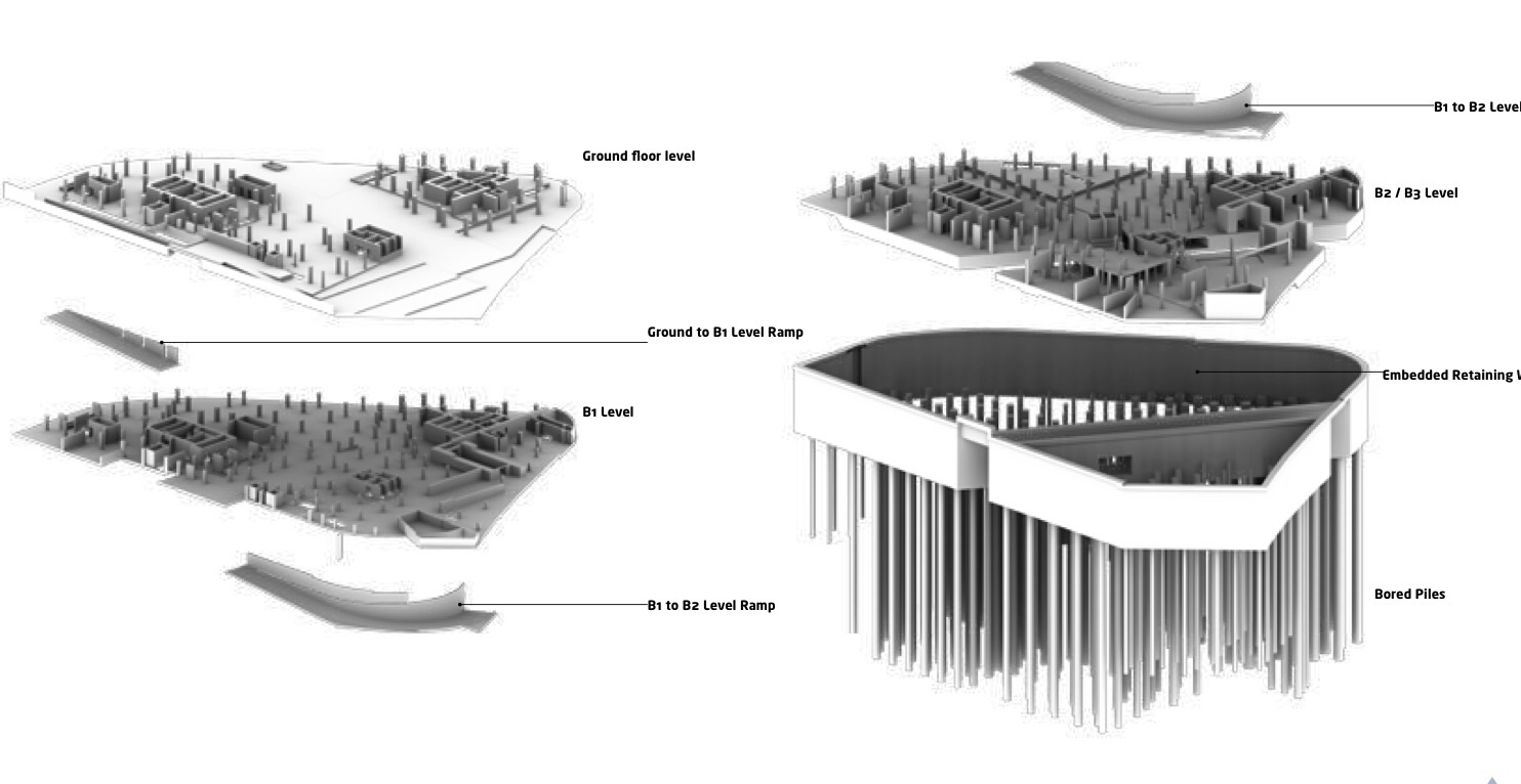 There are two basement levels across the whole site with a third level between the two towers. A 1750mm combined sewer runs through the middle of the site which splits the substructure in two. Groundwater cut off is achieved by two 800mm diaphragm walls boxes either side of the sewer which have a toe depth in the London Clay. The foundations supporting the Superstructure consist of 256 compression and tension bored piles acting in conjunction with the raft at B2 level. These piles vary in diameter ranging between 1800mm and 900mm with the toe in the Thanet Sands. Due to the proposed construction sequence some of the piles contain plunge columns.