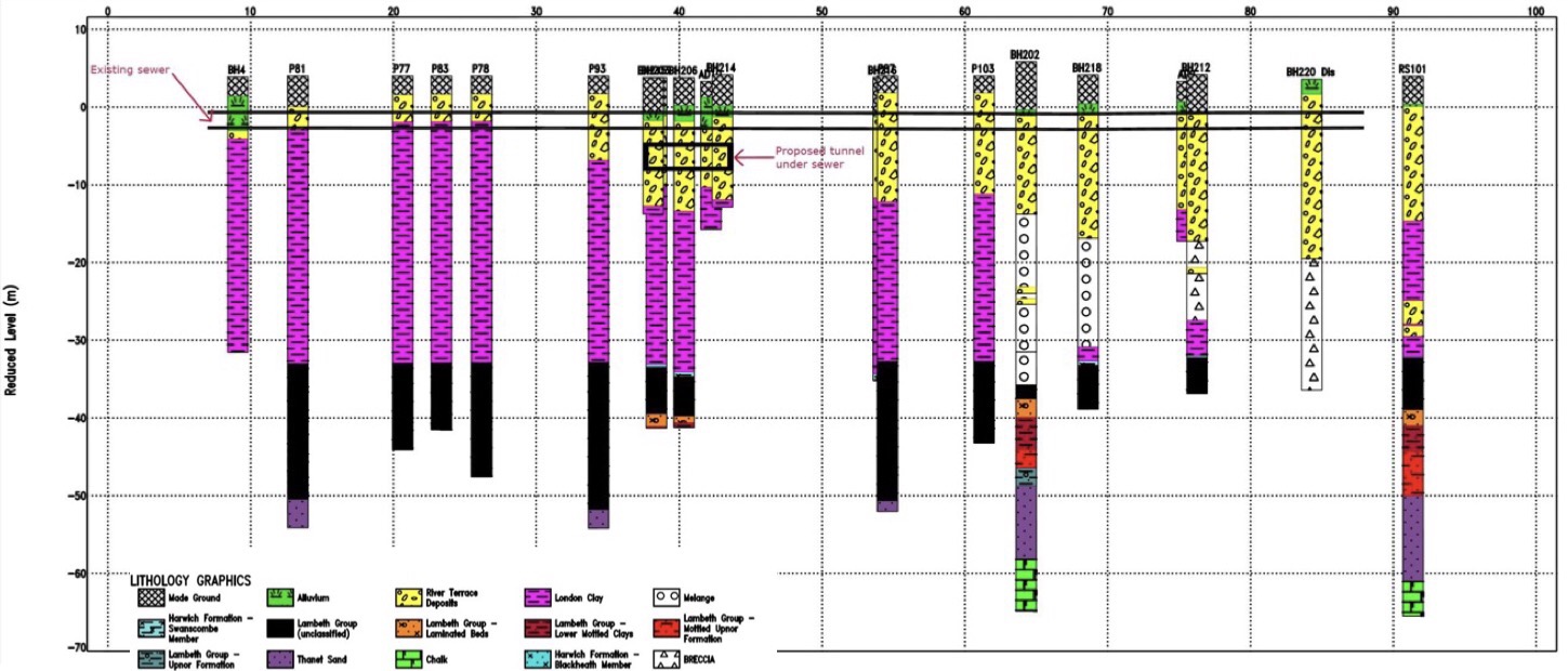 The ground below the site is typical of London and consists of Made Ground (depths between 1.1m – 4.90m), Alluvium (depths between 4.5m – 9.5m), Kempton Park Gravel (depths between 7.5m – 23.0m), London Clay (depths between 22.0m – 31.5m), Lambeth Group (depths between 10.5m – 16.2m), Thanet Sand (depth between 9.2m and 13.0m) above the Newhaven Chalk Formation. Groundwater is between 3.7m and 6.4m deep and is known to fluctuate, with the level of the Thames. Fig 3 below shows the Lithology along the route of the sewer, there is a scour Pingo feature in the East of the site and it can be clearly seen on the right below.