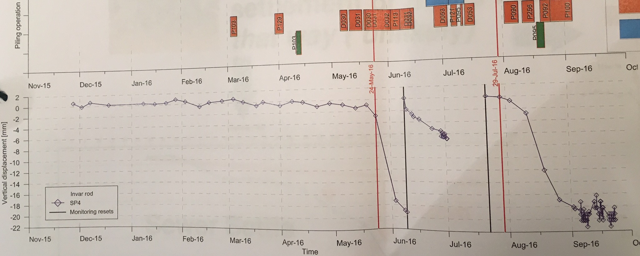The Invar rods although being cheap are not suitable for use during the construction and therefore an internal solution is inevitable. I personally have not done any analysis but I am considering it for a TMR. The designers AKT had estimated settlement during the demolition of the building and a 3D finite element analysis to estimate settlement during the D wall construction. The results suggested the heave from unloading would be the driving factor.