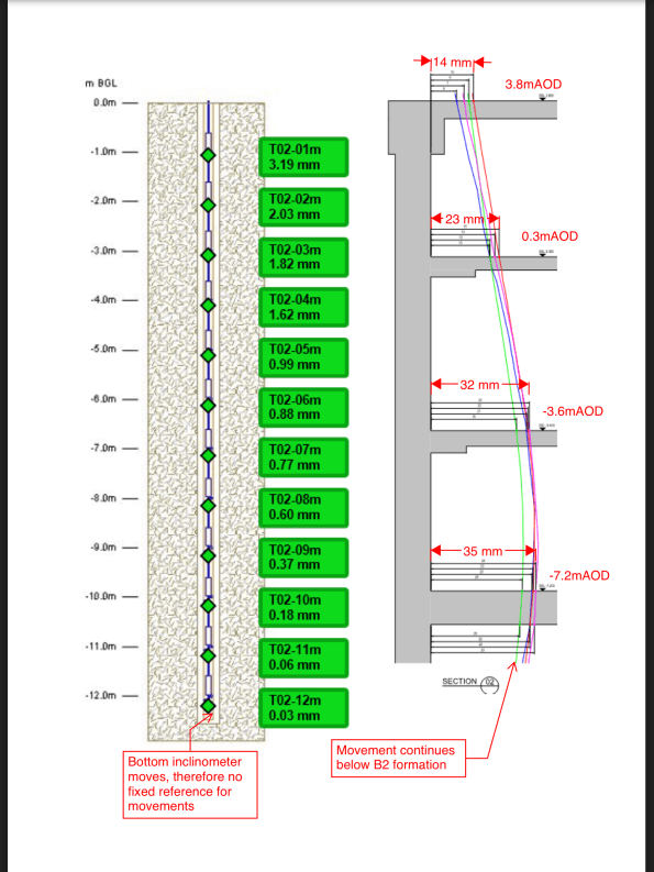 Hmm. Looks like even more fun to come then. They’ll pay the price for jumping the gun and now throw away the time gained, which they’ll have to pay for anyway, whilst trying to negotiate a way forward. Not sure I fully understand the diagram; figures in green boxes don’t seem to relate to dimensions on the section, is this the AKT BBGE comparison? Presumably the floating datum at B2 is tied back in by total station measurement on the wall face. Possible a good thing if this gives at least one guaranteed fixed point. I’d be loath to accept a deeper inclinometer as a reference given the variation in predictions of movement you have.