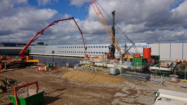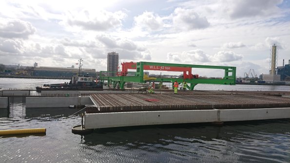 Logistics. Currently there are over 4500 precast concrete elements that are being manufactured in Ireland, by Shay Murtagh, with only 20% of the total delivered there is massive pressure on them to up production. With this increase in production there is added pressure on BAM to get them placed on site, which is difficult requiring a specially built barge to place them, shown below: