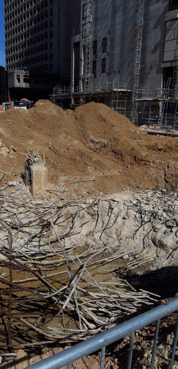 Secondly was the rebar. Bulk removal with a leading edge would simply mean using a muncher to rip up the rebar. However the process of leaving holes in the foundations requires a breaker machine followed by a bloke hot cutting the rebar instead. A trial foundation was dug on site this week and the whole process took 2 days for one pile cap.