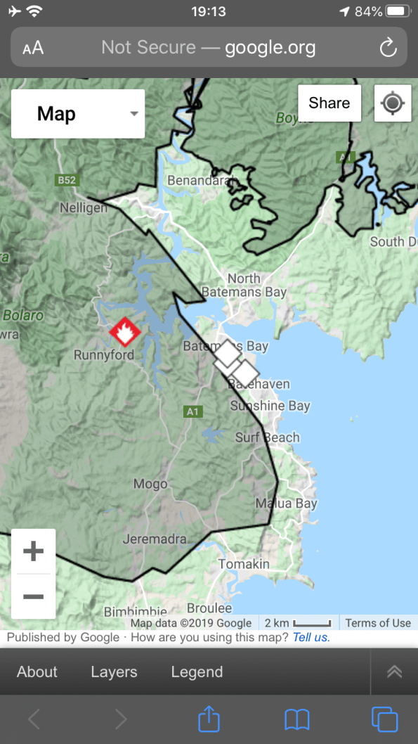 This morning we got a text alert notifying us of an emergency fire situation in Batemans Bay where my site attachment was (we moved down to Melbourne 4 weeks ago). I viewed the online fire tracking website which showed the town is practically cut off by fires. This prompted me to log onto my old project time-lapse cameras to take a look. (Pictures taken one daylight and links below).