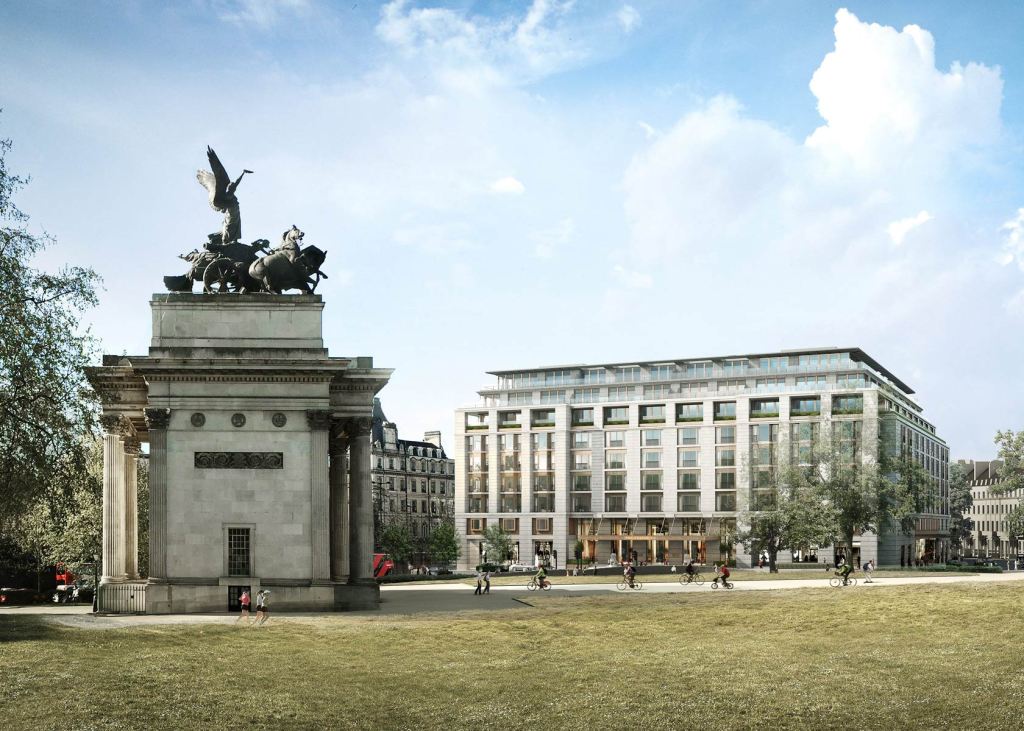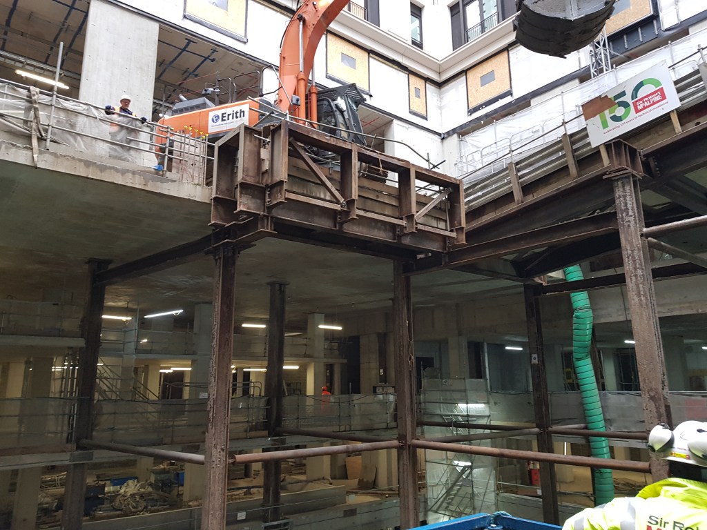 I recently visited a project in London where Sir Robert McAlpine Design Group are the temporary works lead. The project is to build a new hotel/apartment building near Hyde Park at 1-5 Grosvenor Place for Hong Kong and Shanghai Hotels. The building comprises 9 floors above ground and four to five basement levels below. As the basement construction period is significant due to the complex below ground structures, and the volume of material to be excavated and removed from the basement, the method of construction has been ‘top down’. This allows for the basement to be excavated and constructed concurrently with the superstructure construction and fit-out above, with savings to the programme. The building comprises four reinforced concrete ‘cores’ in each quadrant of the building which provide the main vertical access with a central courtyard in the centre. The central courtyard is currently used as the access for plant and material to the basement levels during construction, but will be covered by a garden on completion. The main structure has been completed with the first floors now being clad. The last two floors of the basement are currently being excavated down to approximately 20m below ground level.