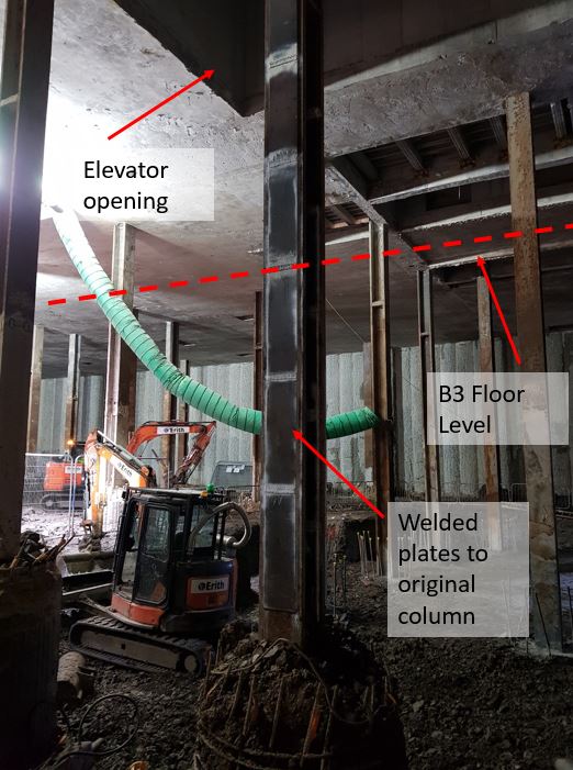The basement is currently being excavated over the final two floors. This has been in order to enable large sized plant to operate and to allow removal of adequate volumes of clay per shift. Originally the design of the building only included three basement floors as planning permission for a fourth had not been granted during the design phase. However, later during construction a fourth basement floor was approved. This caused an issue with some of the existing columns that had already been installed. They would be too slender to take the loads from above in the temporary state before basement level 3 had been constructed. The increase in effective length between B2 and B4 level meant that some of the columns would need to be modified. In the image below shows where additional plates have been welded to the flanges of the columns to make them stockier and reduce their slenderness ratio.