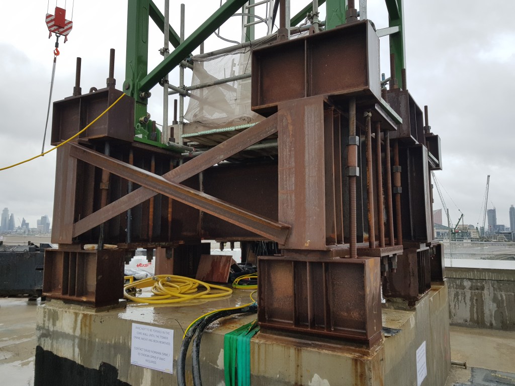The temporary works on this project have been significant and I thought I would show the extent of them here. At each core of the building a crane has been placed on the roof. Placing cranes on the cores allows the building to be substantially completed and made watertight without having a void through the building for the tower crane mast. This has required a temporary works solution to provide a base to fix the crane. The supporting concrete core has been designed and enhanced to withstand the tensile stresses caused by the crane which has required bursting steel reinforcement. Note also the long post stressed threaded connections which are required to take the tensile stresses of the crane.