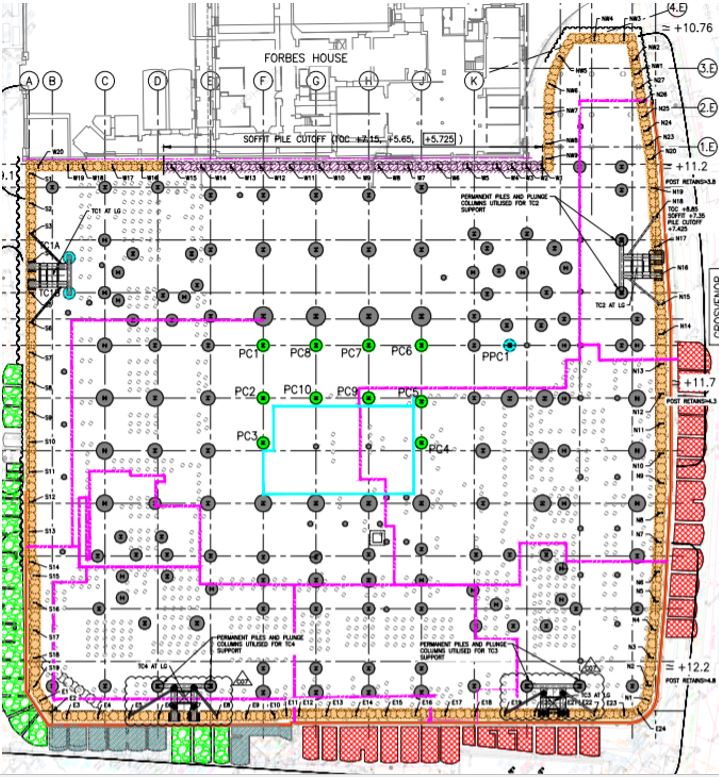 The steel structure is supported by large plunge columns that will eventually be removed and cut at pile cap level (see columns highlighted in green in the drawing below). The ramp and bridge allow site traffic to enter one side of the building and exit the other. A telescopic clamshell bucket shown in the image above is able to extract the spoil from the basement levels below and load it onto trucks passing over the temporary road structure.