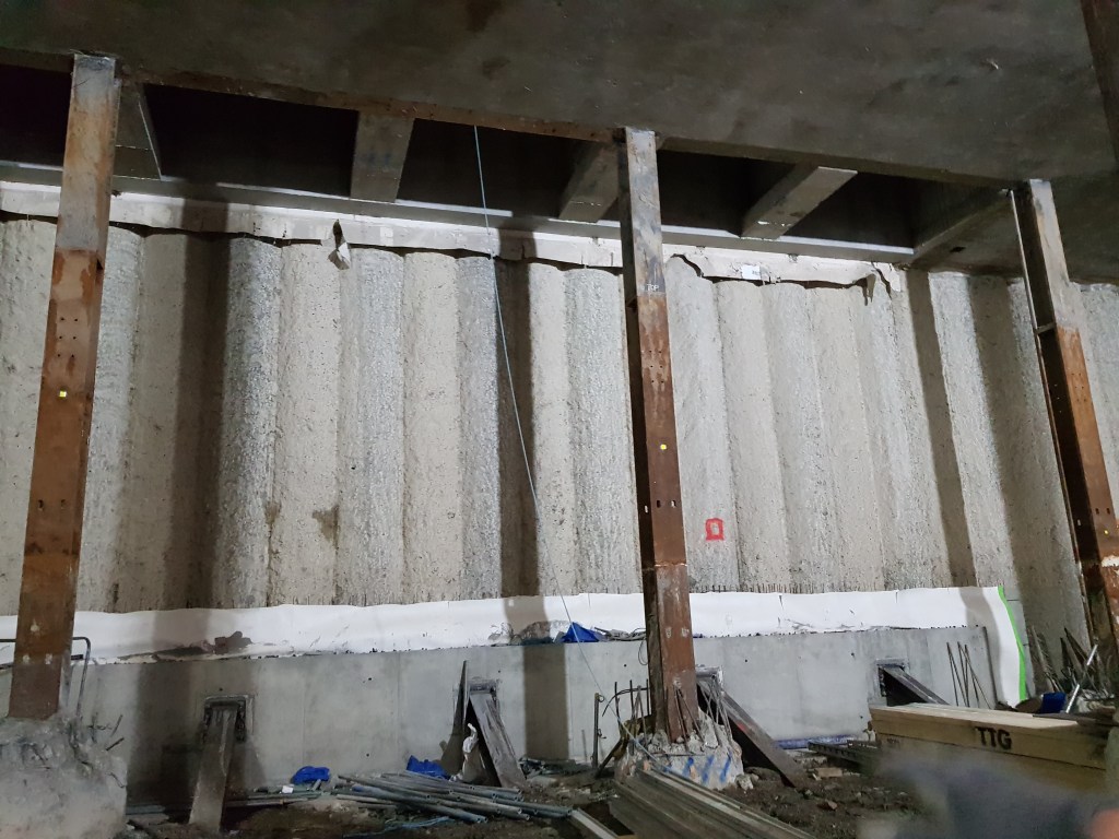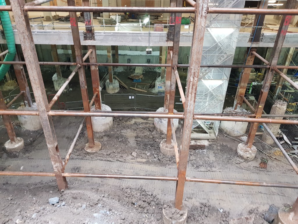 At basement level 1.2m diameter secant piles have been installed around the whole perimeter of the site (orange above). In particular propping has been required to strengthen the piling on the west end of the site where another building abuts the site closely (purple line above). This has been to limit the deflection of the secant piles and therefore limit the effects on the adjacent structure. Inclinometers have been installed down the length of these piles to monitor any significant deflection.