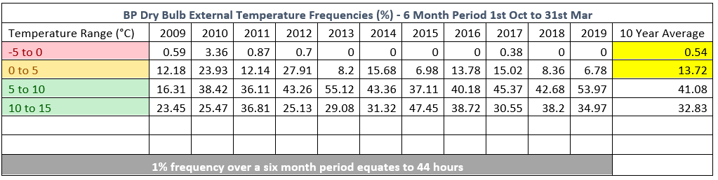The table I collated below disputes the ‘doesn’t often drop below 5°C’ assertion, over a 10 year average from onsite external temperature data it can be shown that for approximately 14.26% of a six month period the external temperature will drop below 5°C. The passive fabric heating effects of a LTHW system cannot be relied upon to maintain the buildings usual thermal mass, the rooms could haemorrhage heat due to infiltration and the current solution cannot remedy this at night time. Rather than trusting in belated heat loss calculations I believe it will be necessary to carefully monitor the rooms heat retention capabilities via existing temperature monitors and we should be prepared to upscale/adjust the heating solution (or relax certain constraints if possible) where necessary.