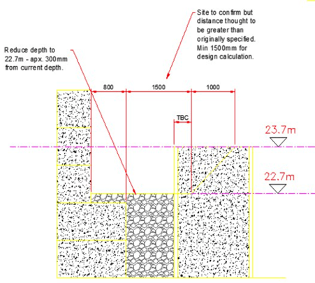 The platform needed lowering by about 1m over a 20m length to reduce the loading on the vent shaft – by removing 20m3 of 6F2 crush we would be able to reduce the loading on that area by about 48 tonnes. The sketch below shows the requirement to lower the platform from 23.700m to 22.700m.