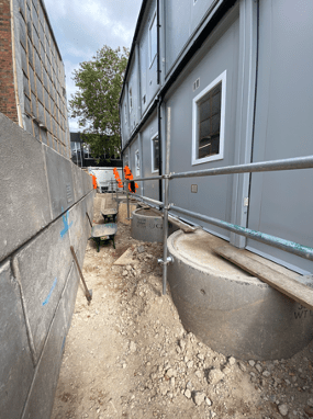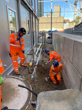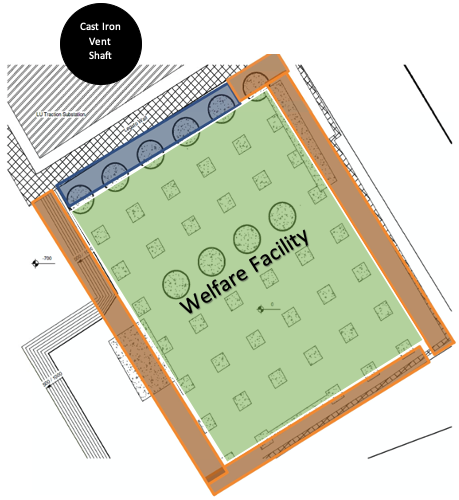However shortly after installation, the temporary works team contacted me to say that their calculations for the welfare platform had been Category 3 checked (the highest level of check, conducted when there is a high risk to a third-party asset) and had failed. It failed on the basis that the crush (6F2) platform on which the footpath was going to sit was exerting too much pressure on the adjacent cast iron Victorian London Underground vent shaft and could lead to a catastrophic failure. Consequently the temp works team said that the platform needed lowering along one side of the welfare facility (see diagram below – area to be lowered in blue.).